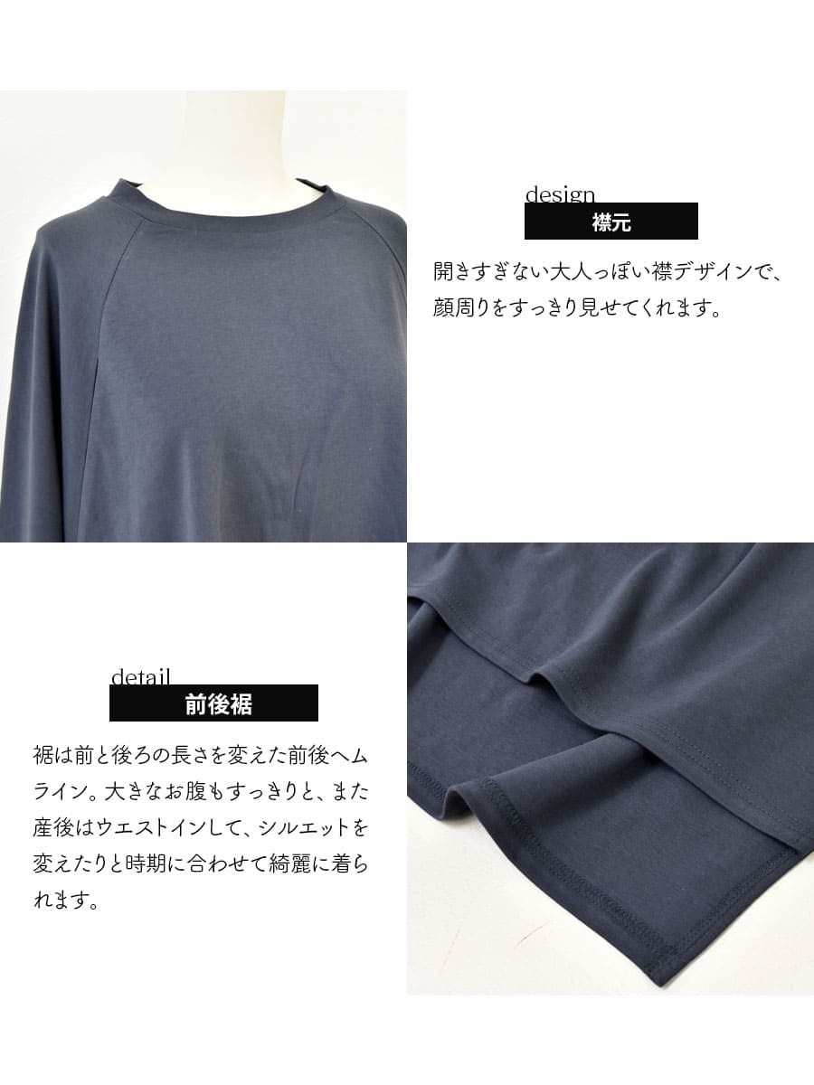 たっぷり贅沢に使った肌に優しい綿(コットン)100%素材がつくるラインも華やかに、産前産後の気になる部分をカバーしつつ素敵にみせてくれます。