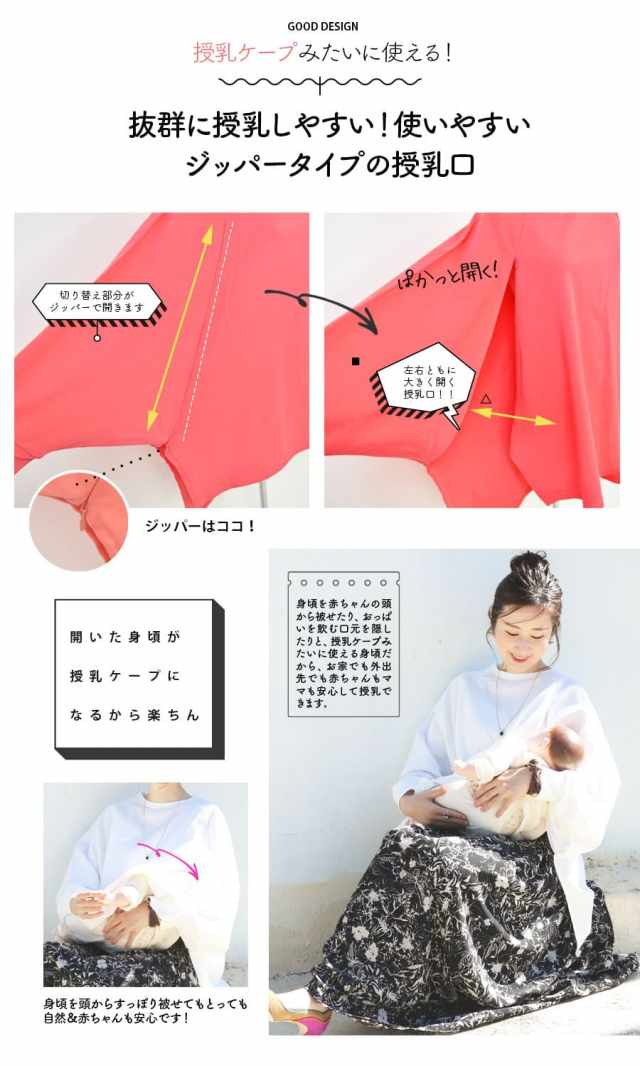必要な分だけ開いて授乳でき、たっぷりある身頃が授乳ケープがわりになるので、赤ちゃんの口元を隠したり、頭からすっぽり被せたりとお家でも、外出先でもさっと簡単に自然な授乳が叶います。