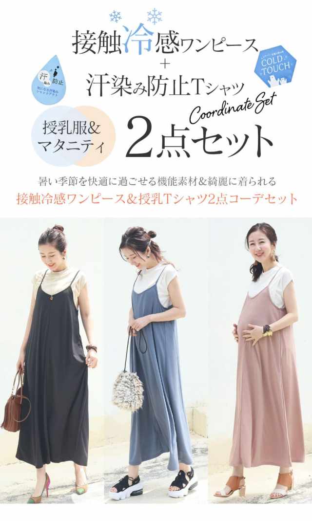 暑い季節を快適に過ごせる機能素材&綺麗に着られるワンピース&授乳Tシャツ2点コーデセットです。