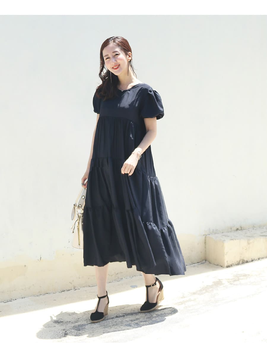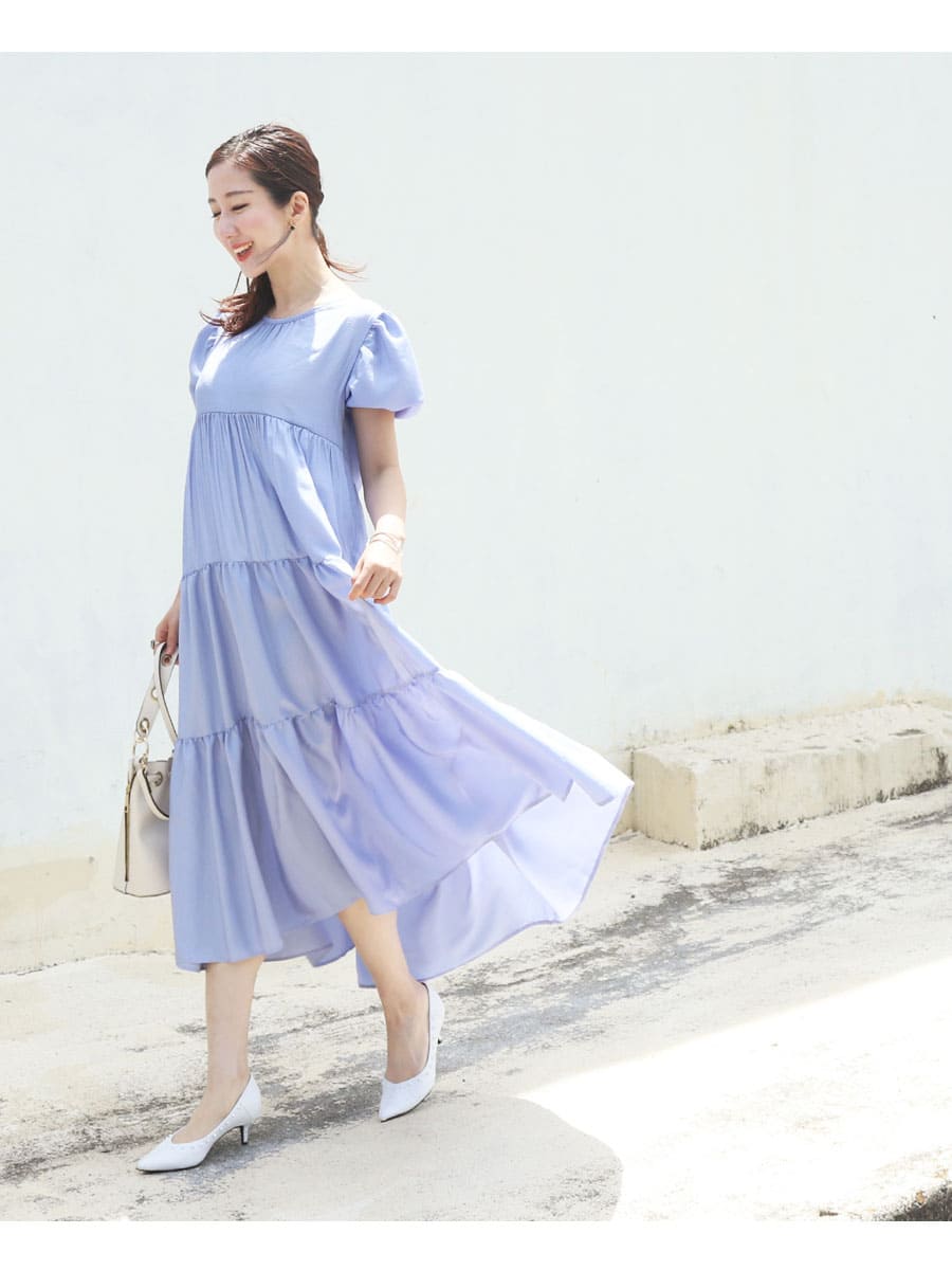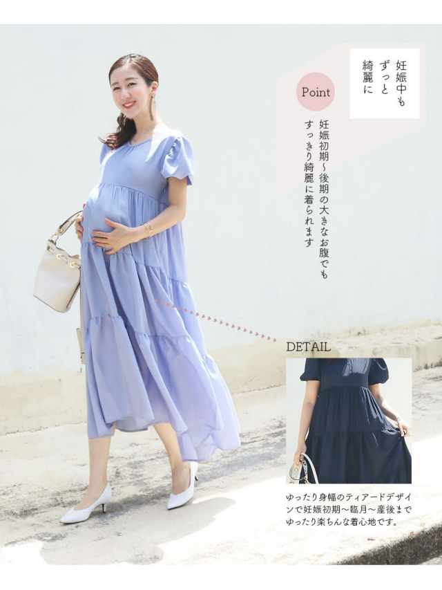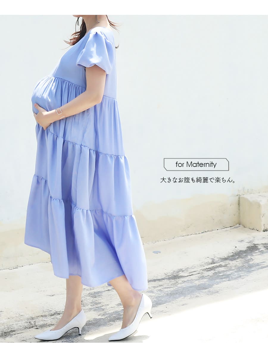 広がる綺麗なティアードシルエットが映えるエレガントでロマンティックなマタニティ&授乳ワンピースです。