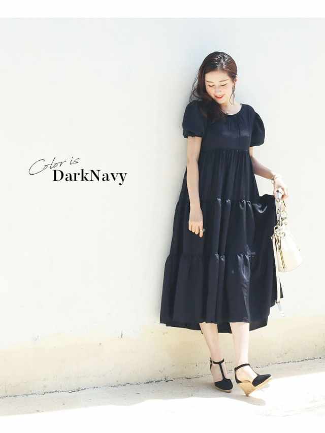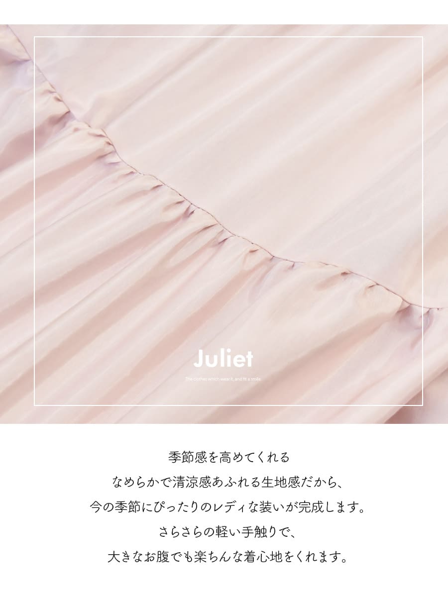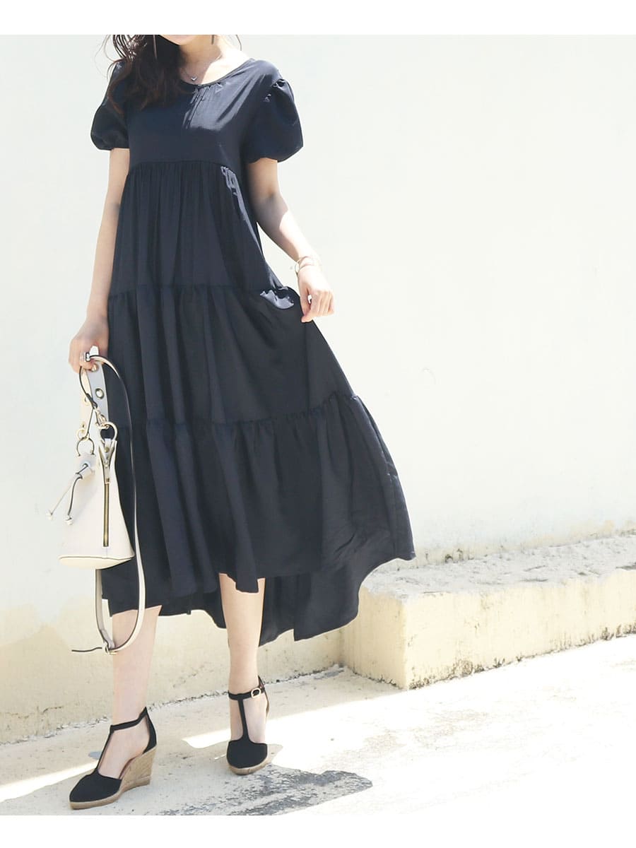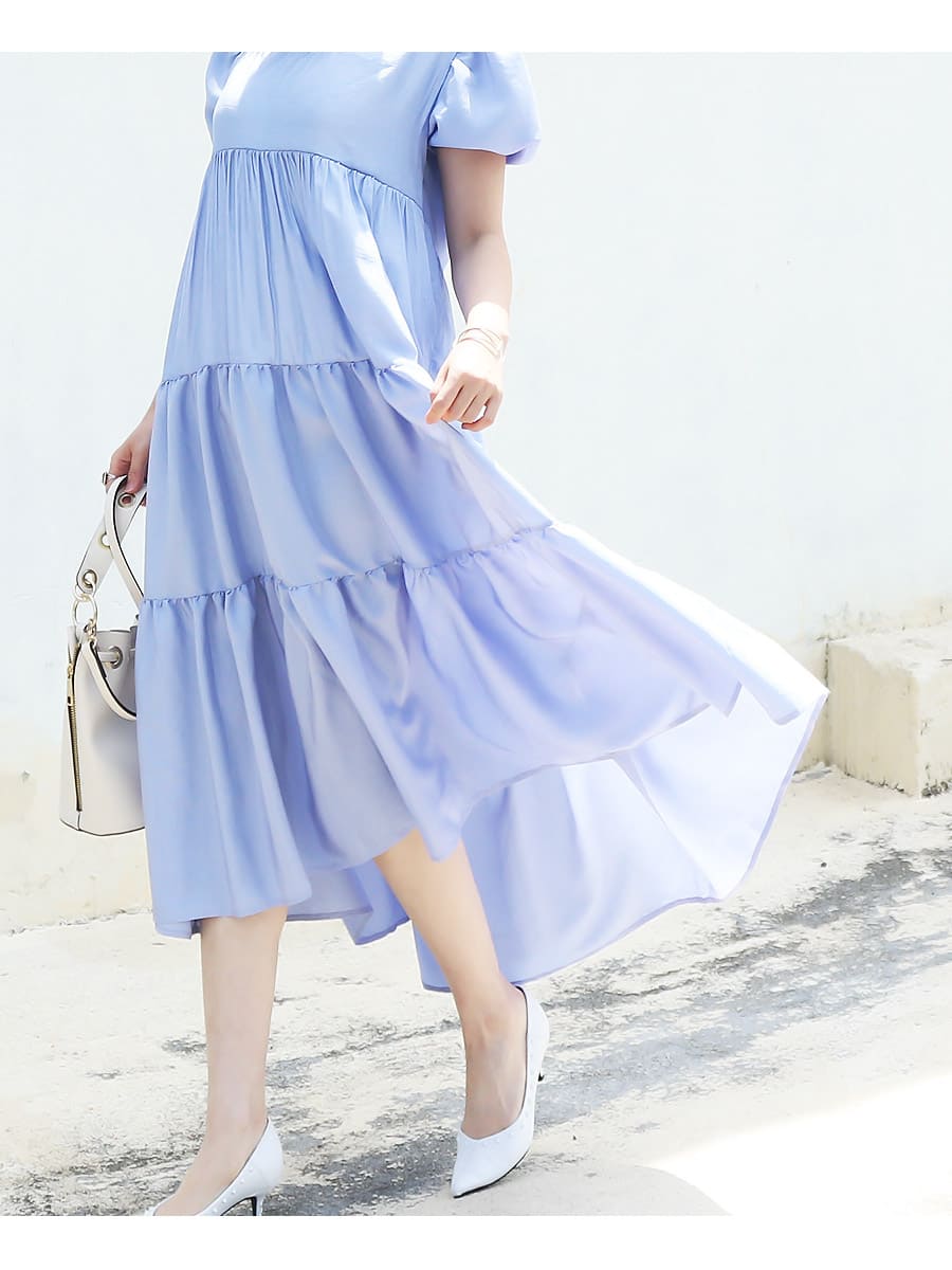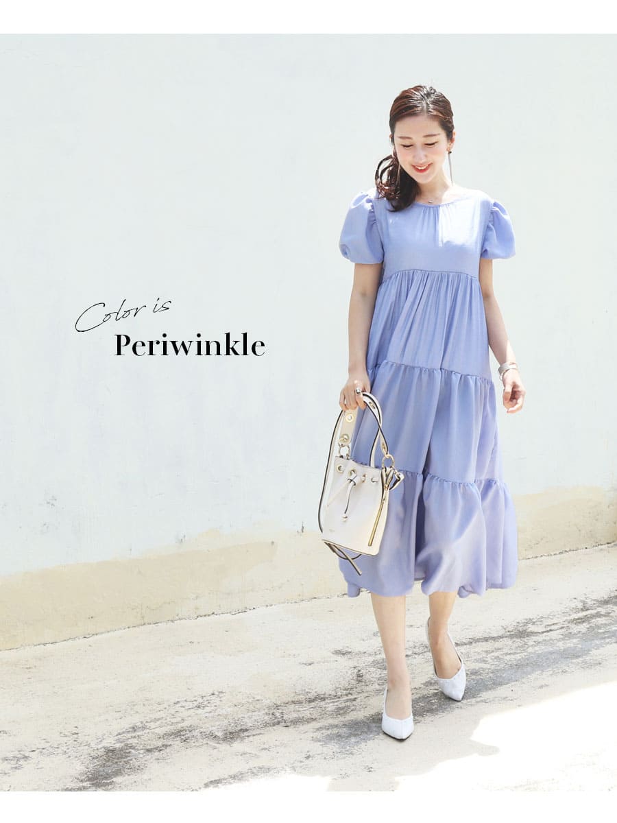 広がる綺麗なティアードシルエットが映えるエレガントでロマンティックなマタニティ&授乳ワンピースです。