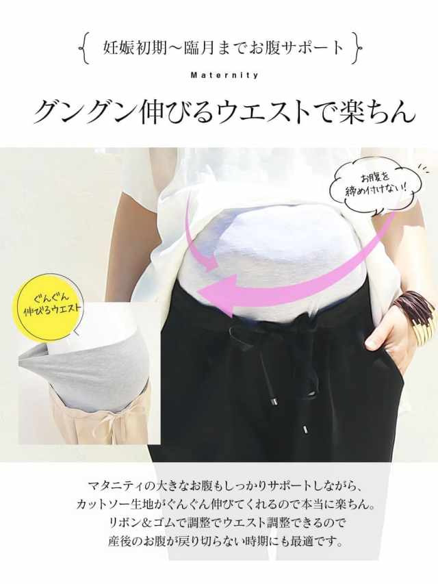 ウエストリボン&ゴム仕様で調整できるので、妊娠初期〜産後のお腹が戻りきらない時期までお使いいただけます。
