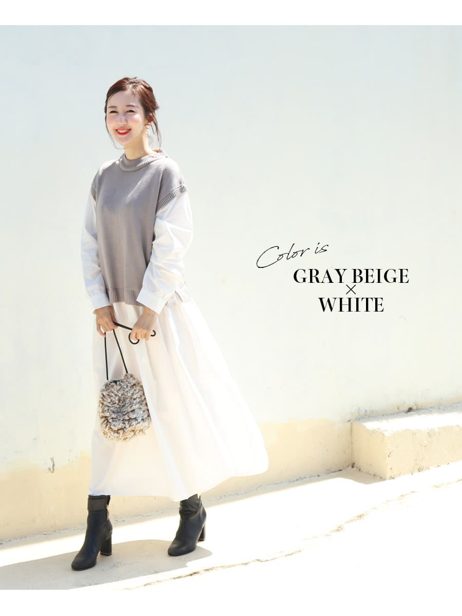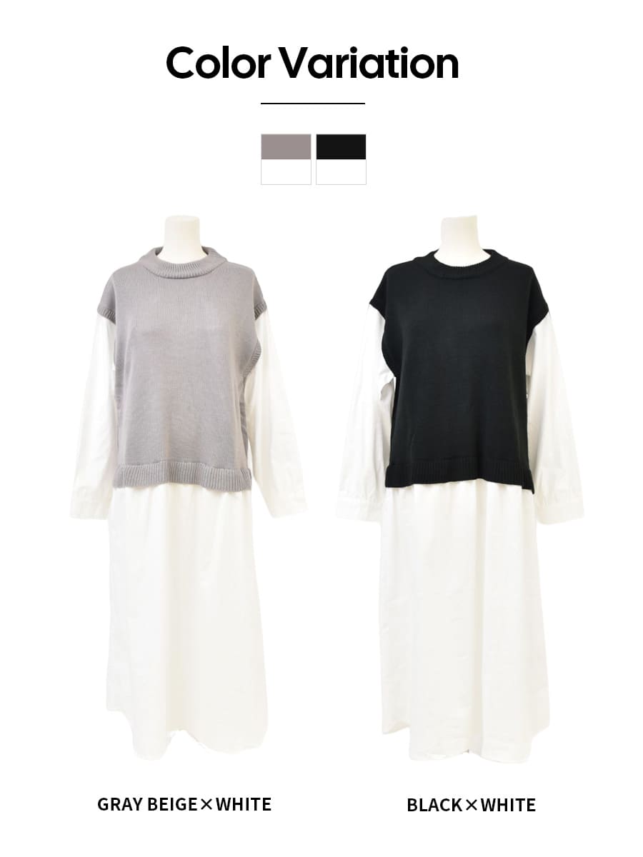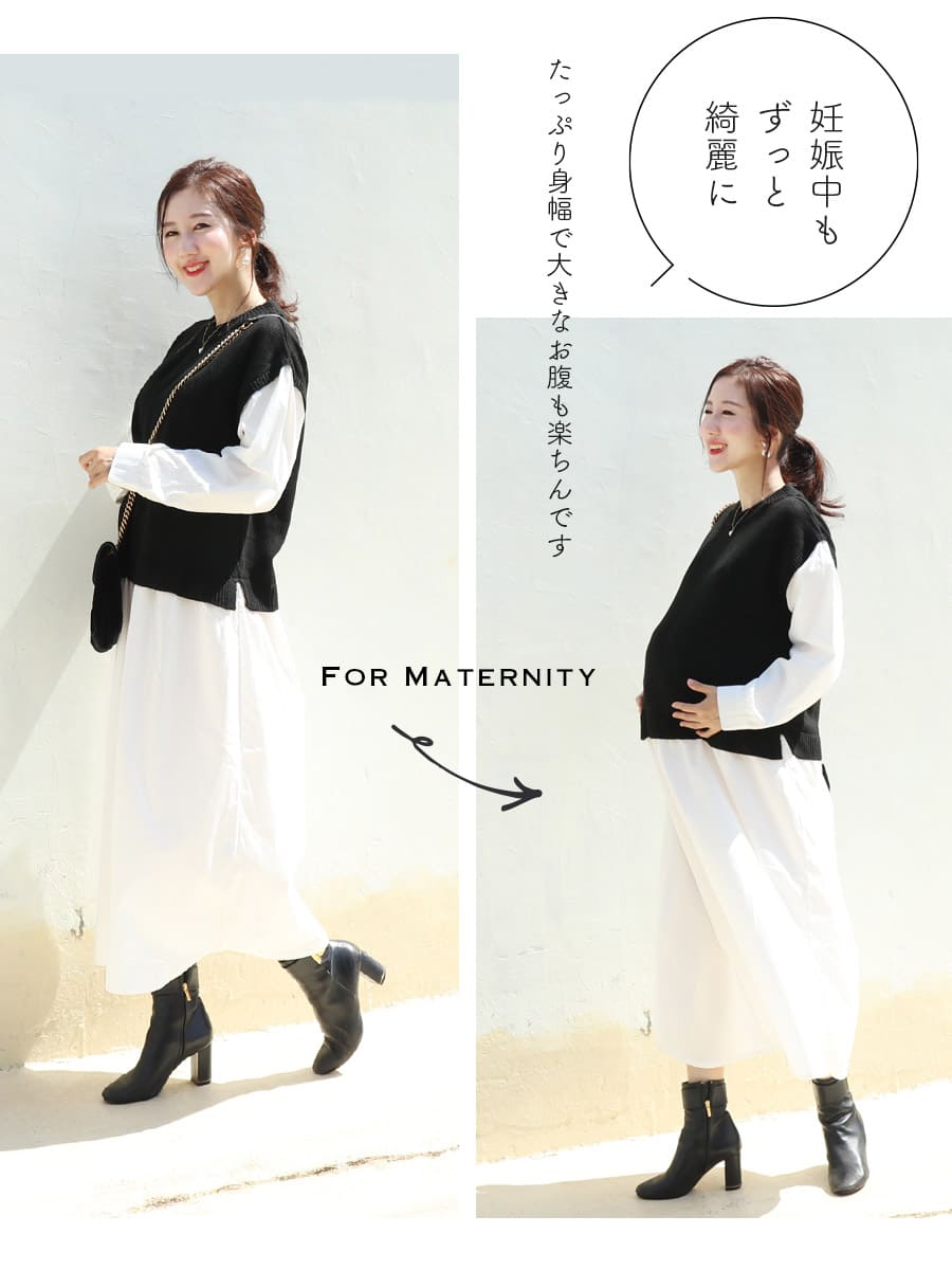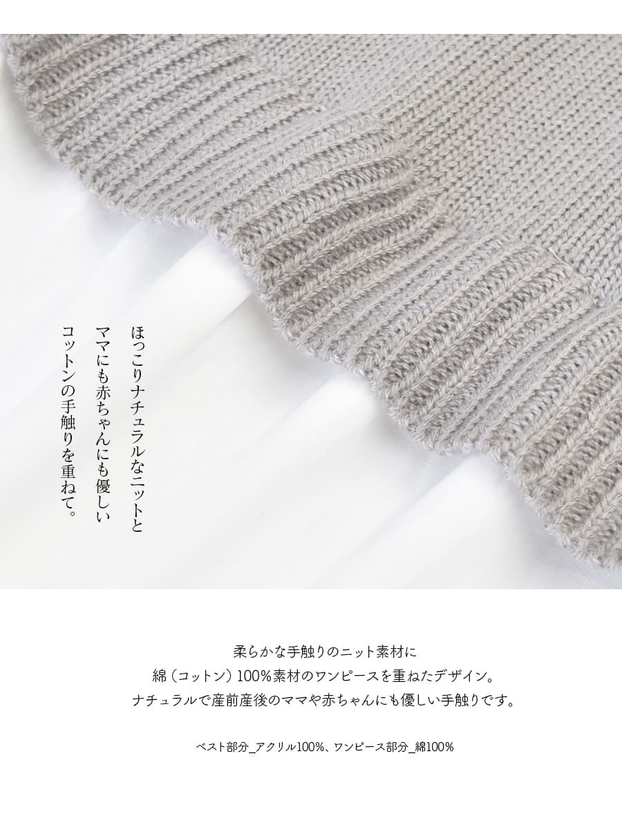 ナチュラルなテイストのニットベストと綿100%素材のワンピースをドッキングした、一枚でコーディネートが完成する重ね着風の授乳&マタニティワンピースです。