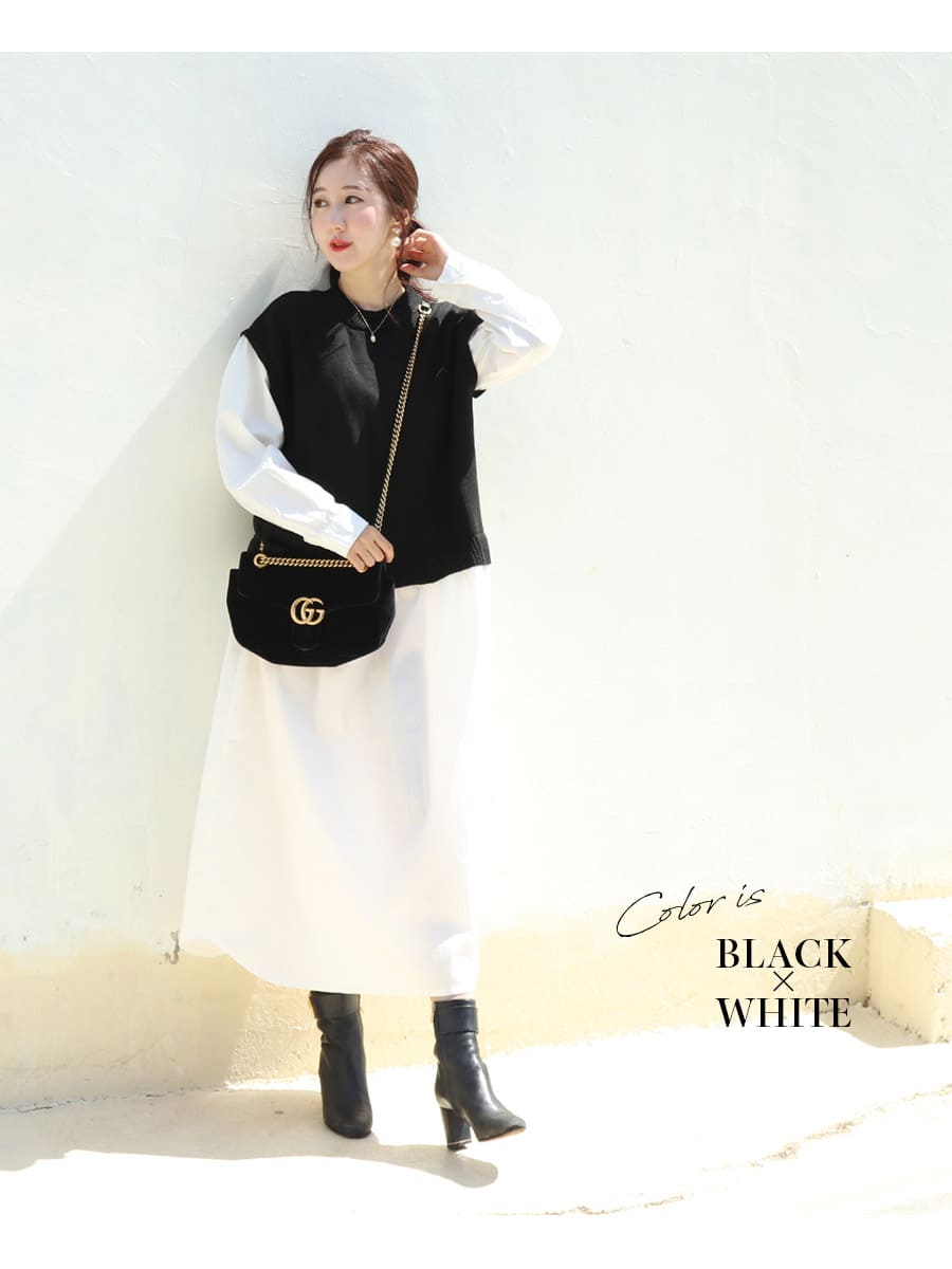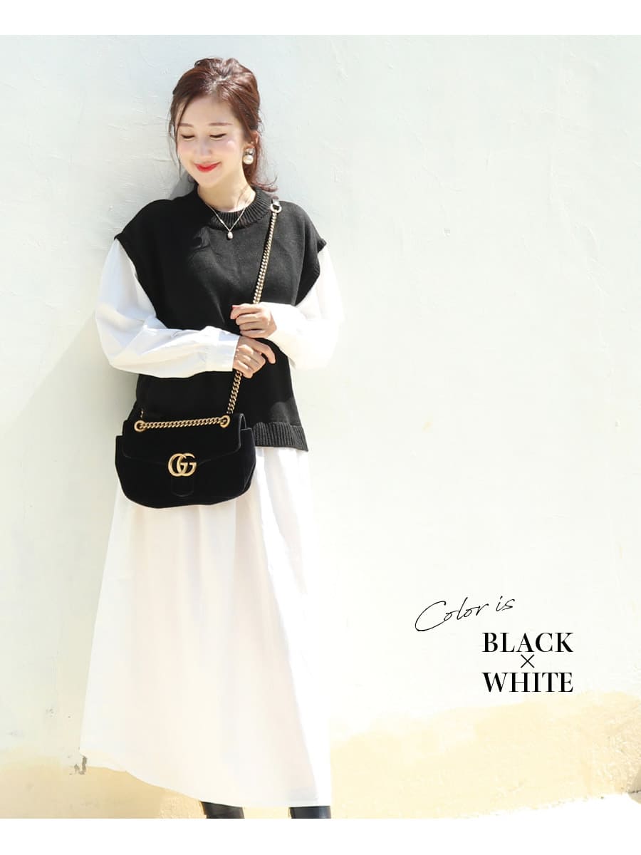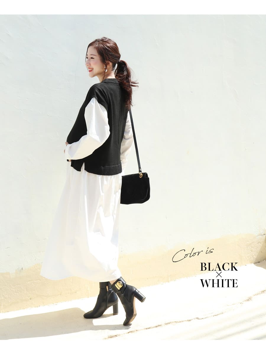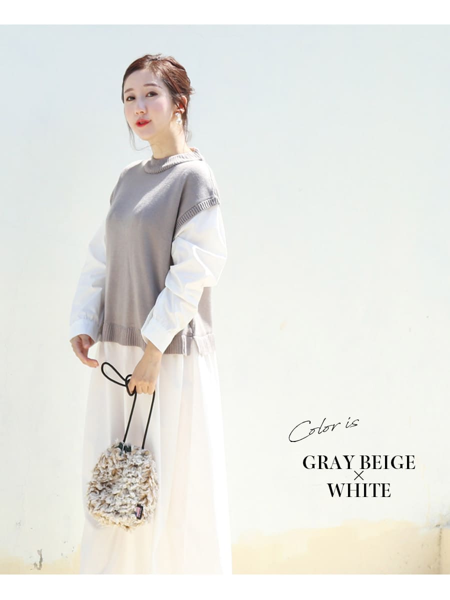 ナチュラルなテイストのニットベストと綿100%素材のワンピースをドッキングした、一枚でコーディネートが完成する重ね着風の授乳&マタニティワンピースです。