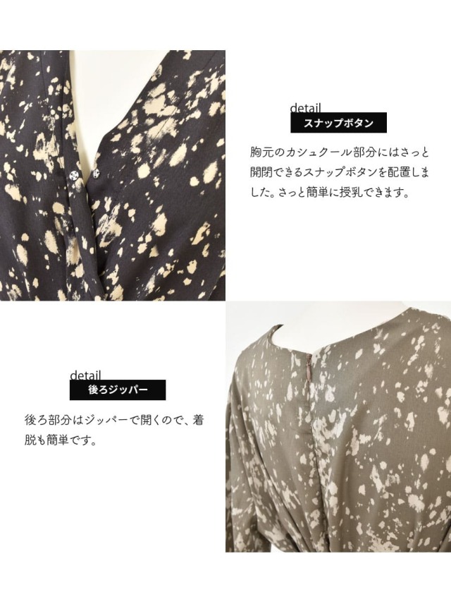 胸元のスナップボタン付きのカシュクール部分を、さっと引き下げるだけで授乳できます。