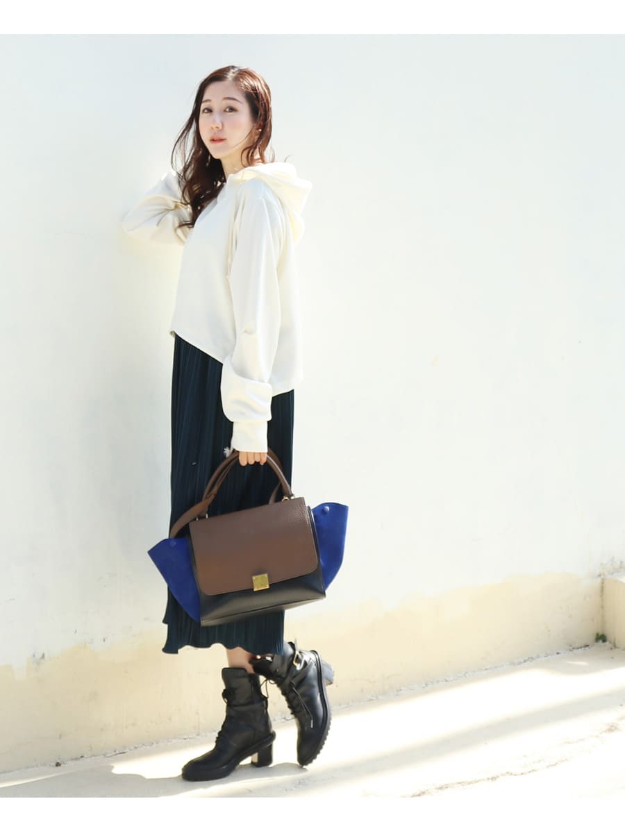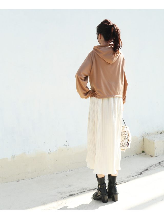 スカートはしっかりとしたハリのあるランダムプリーツを使い、女性らしいエレガントな雰囲気をプラス。