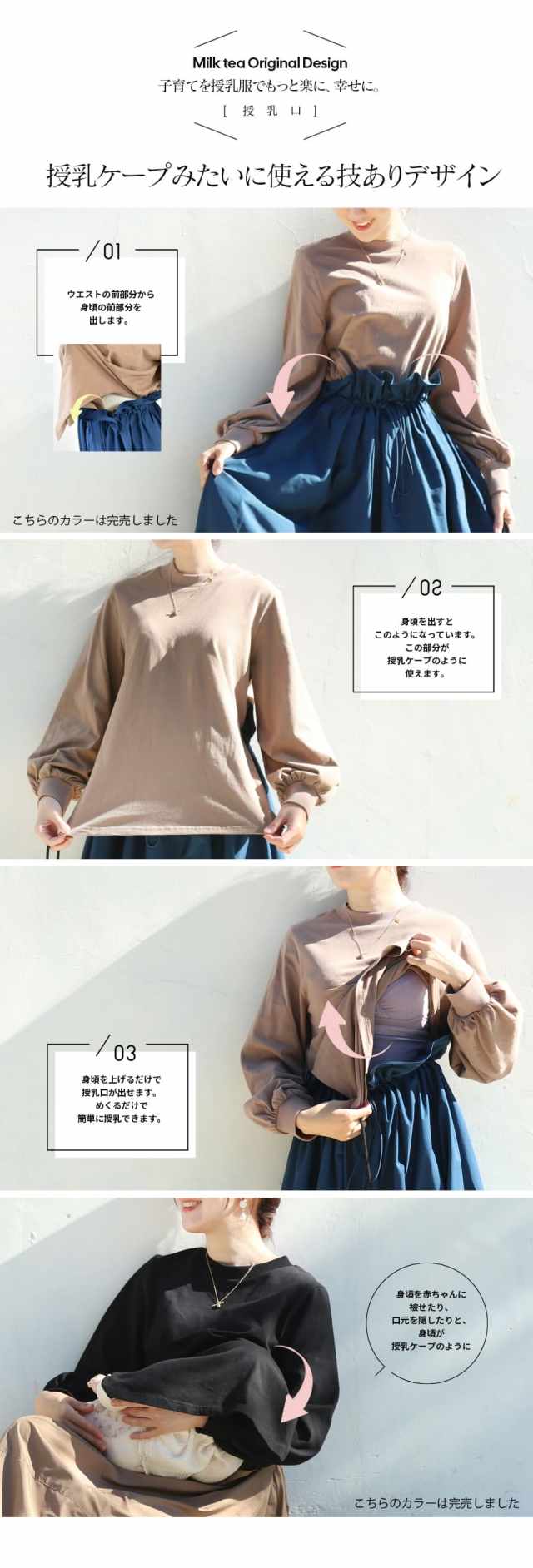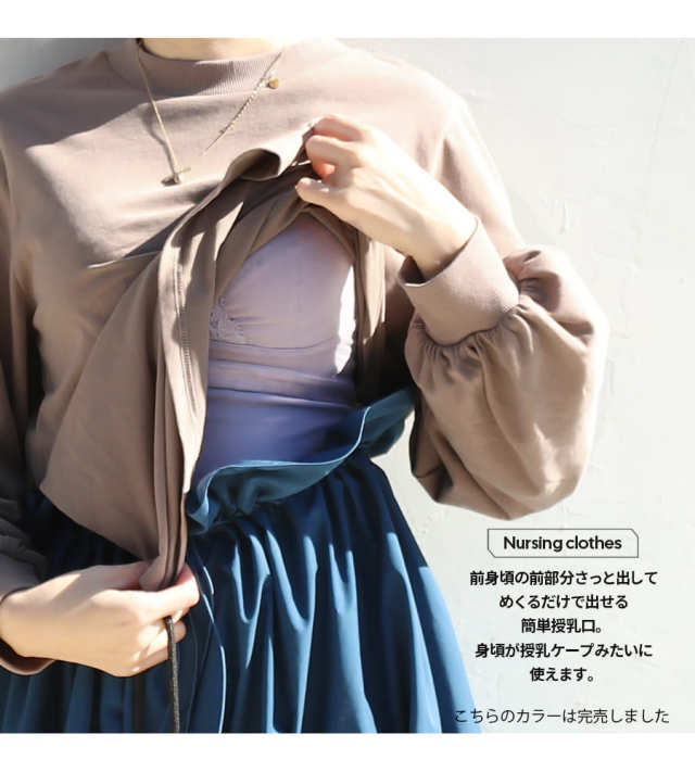 授乳は前のウエスト部分からトップスの前部分をさっと引き出し、めくるだけの簡単授乳口。