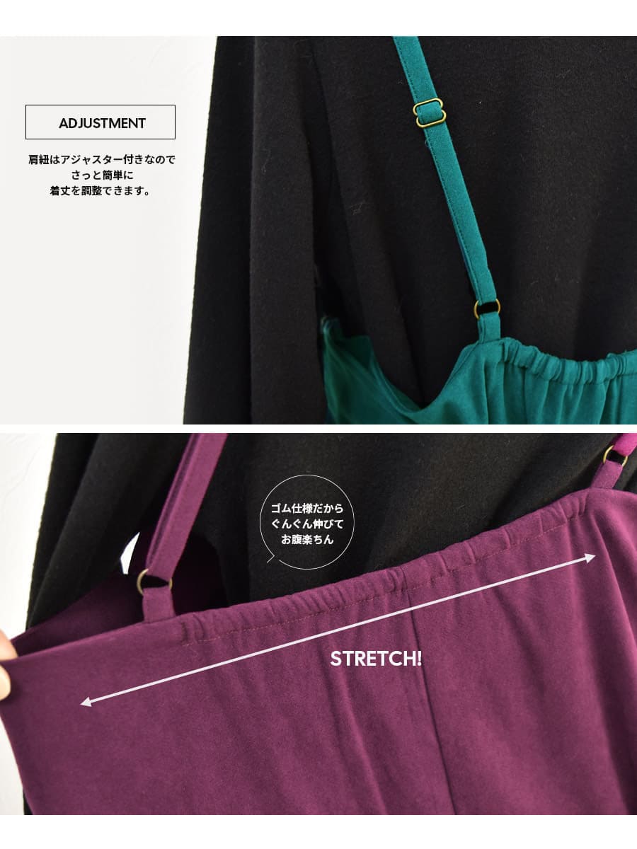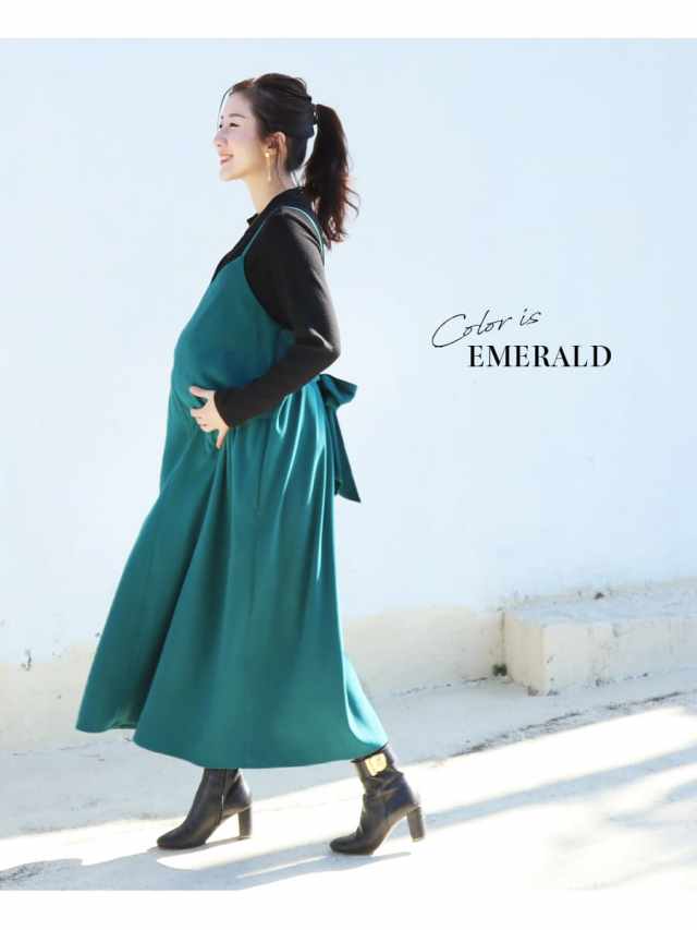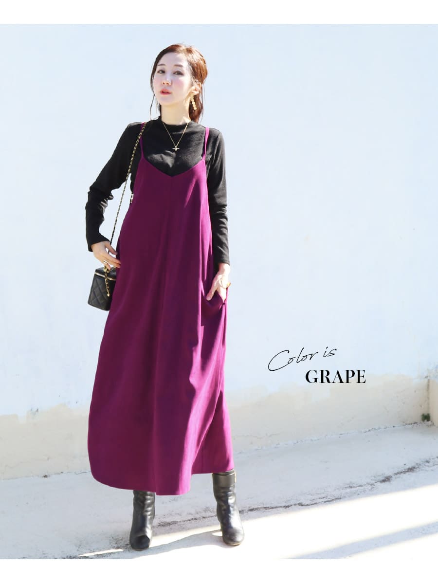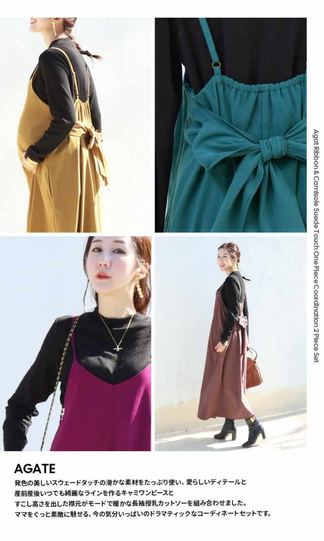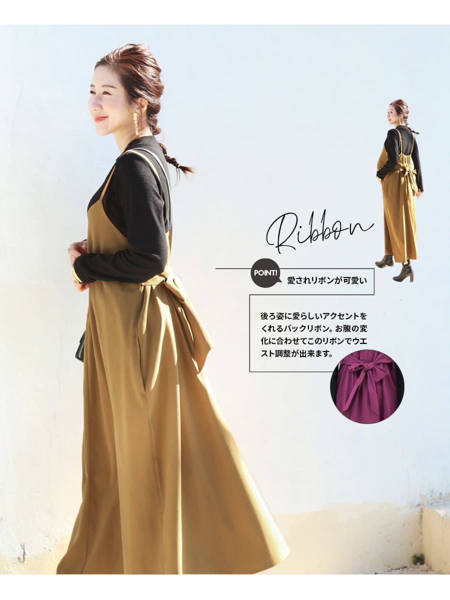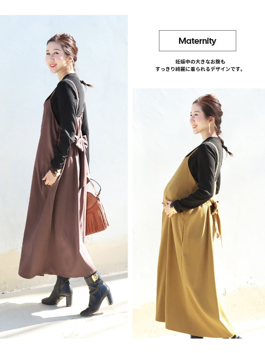 発色の美しいスウェードタッチの滑かな素材をたっぷり使い、愛らしいディテールと産前産後いつでも綺麗なラインを作るキャミワンピース。