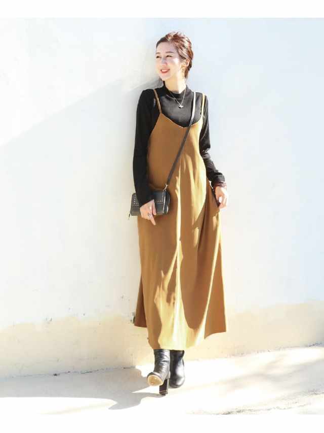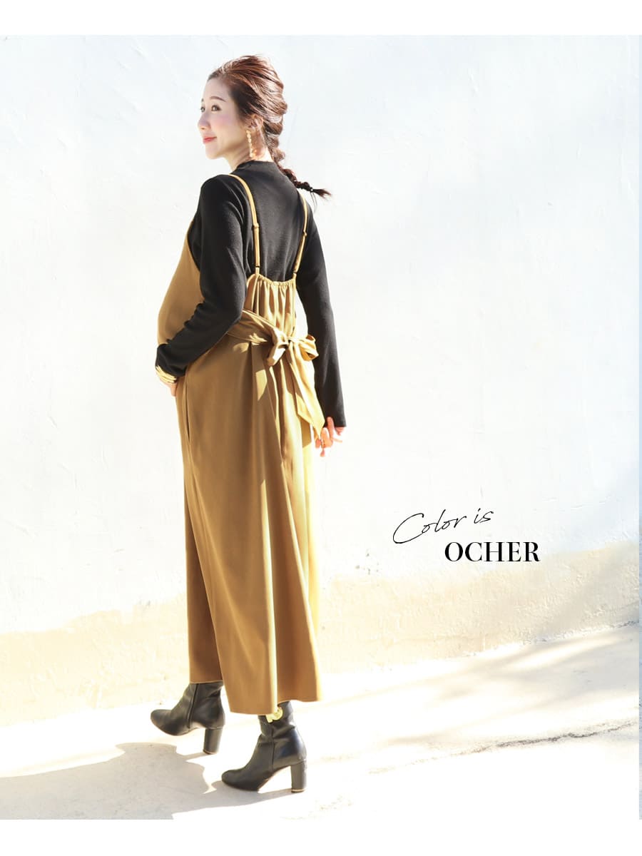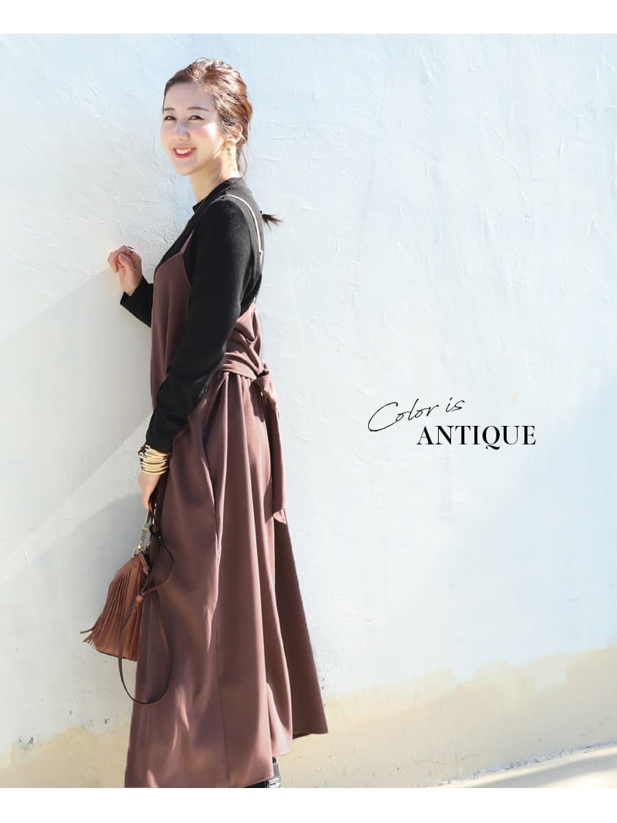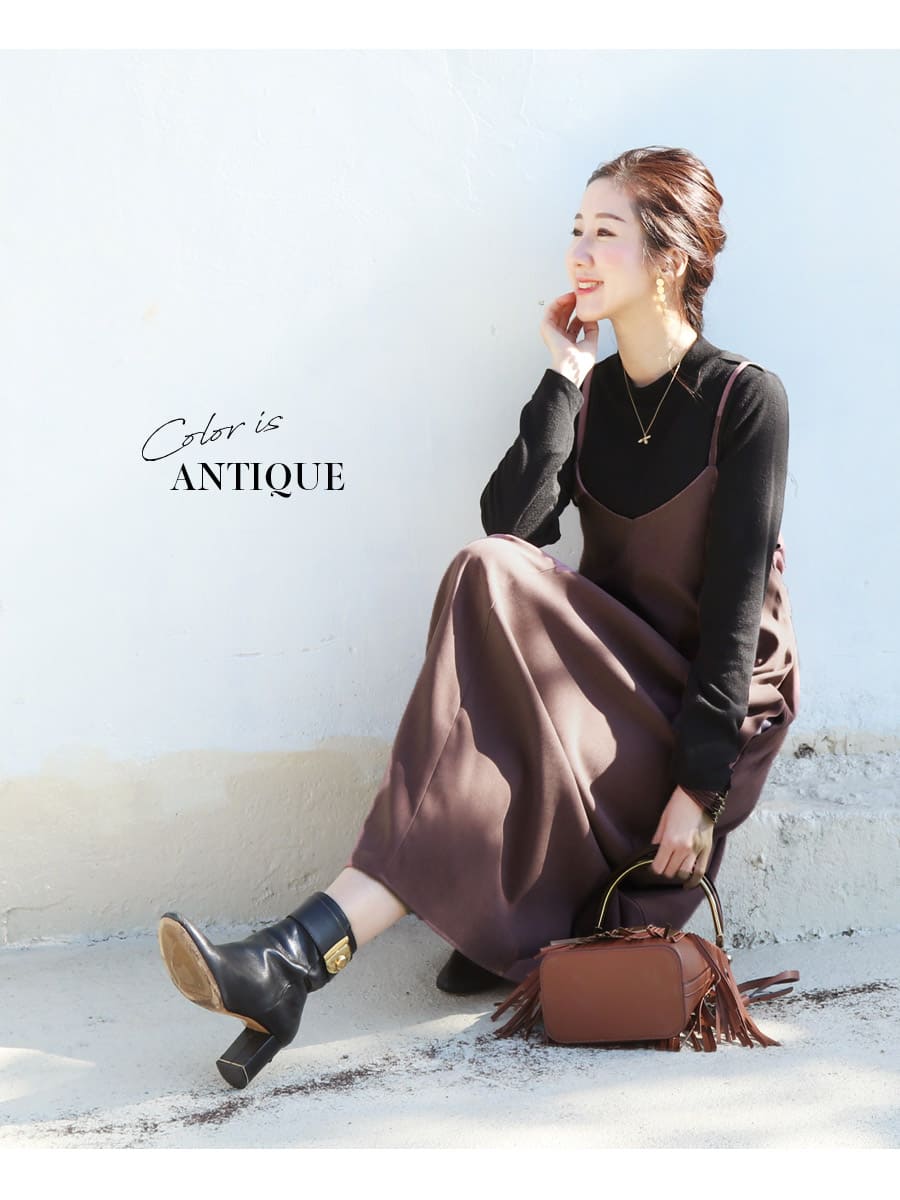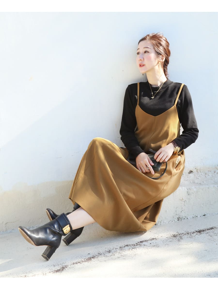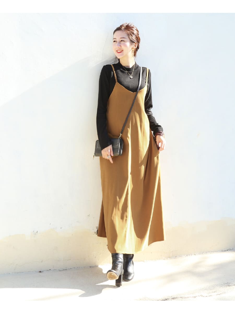 発色の美しいスウェードタッチの滑かな素材をたっぷり使い、愛らしいディテールと産前産後いつでも綺麗なラインを作るキャミワンピース。