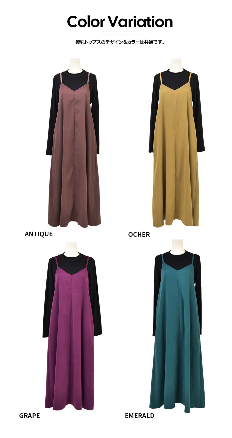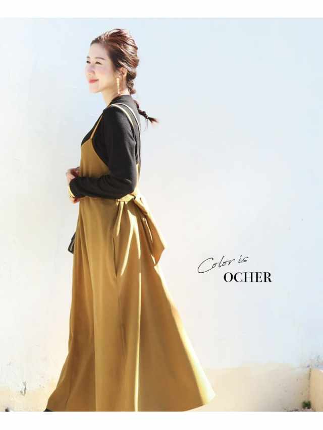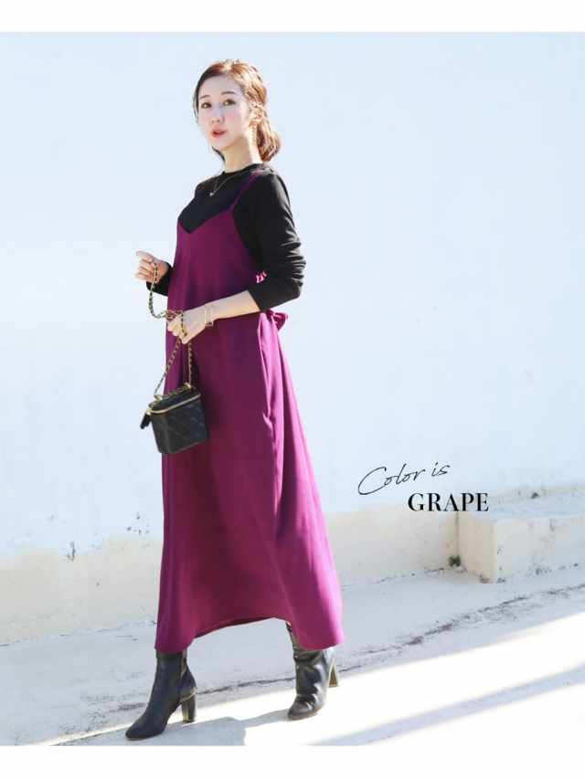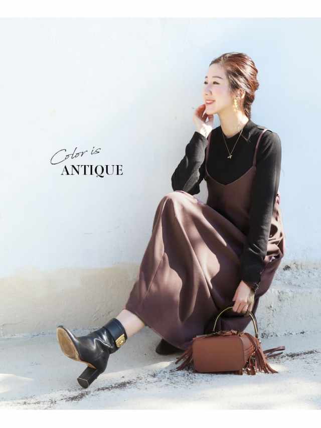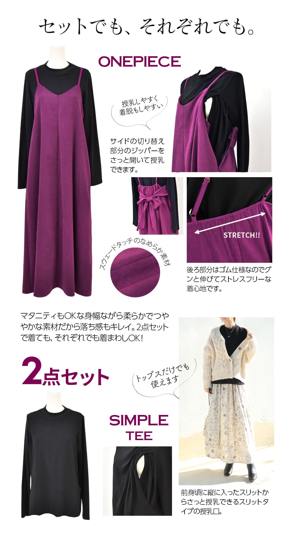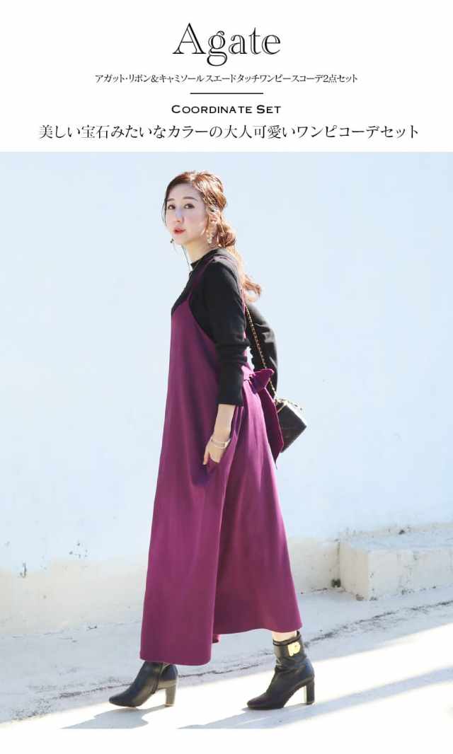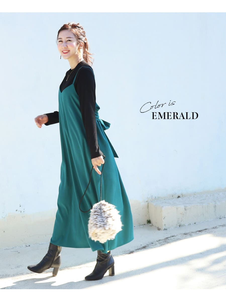 発色の美しいスウェードタッチの滑かな素材をたっぷり使い、愛らしいディテールと産前産後いつでも綺麗なラインを作るキャミワンピース。