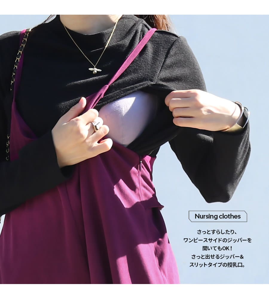 すこし高さを出した襟元がモードで暖かな長袖授乳カットソーを組み合わせた、宝石みたいなママをぐっと素敵に魅せるドラマティックなコーディネートセットです。