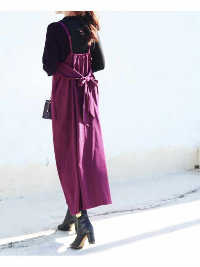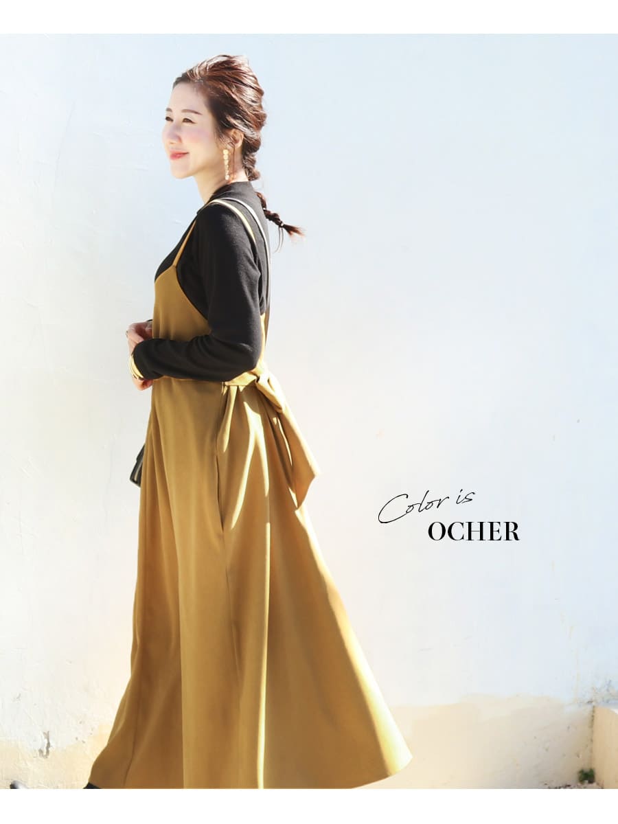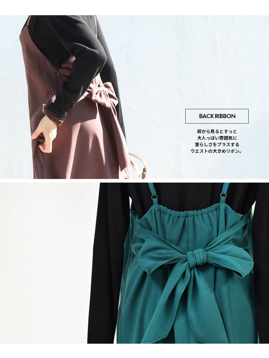 ワンピースはフレアーラインのシンプルなキャミワンピースをベースに後ろに大きなリボンをあしらった愛らしいデザイン。