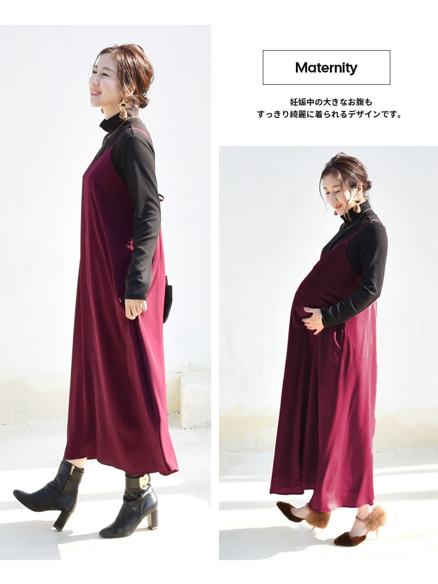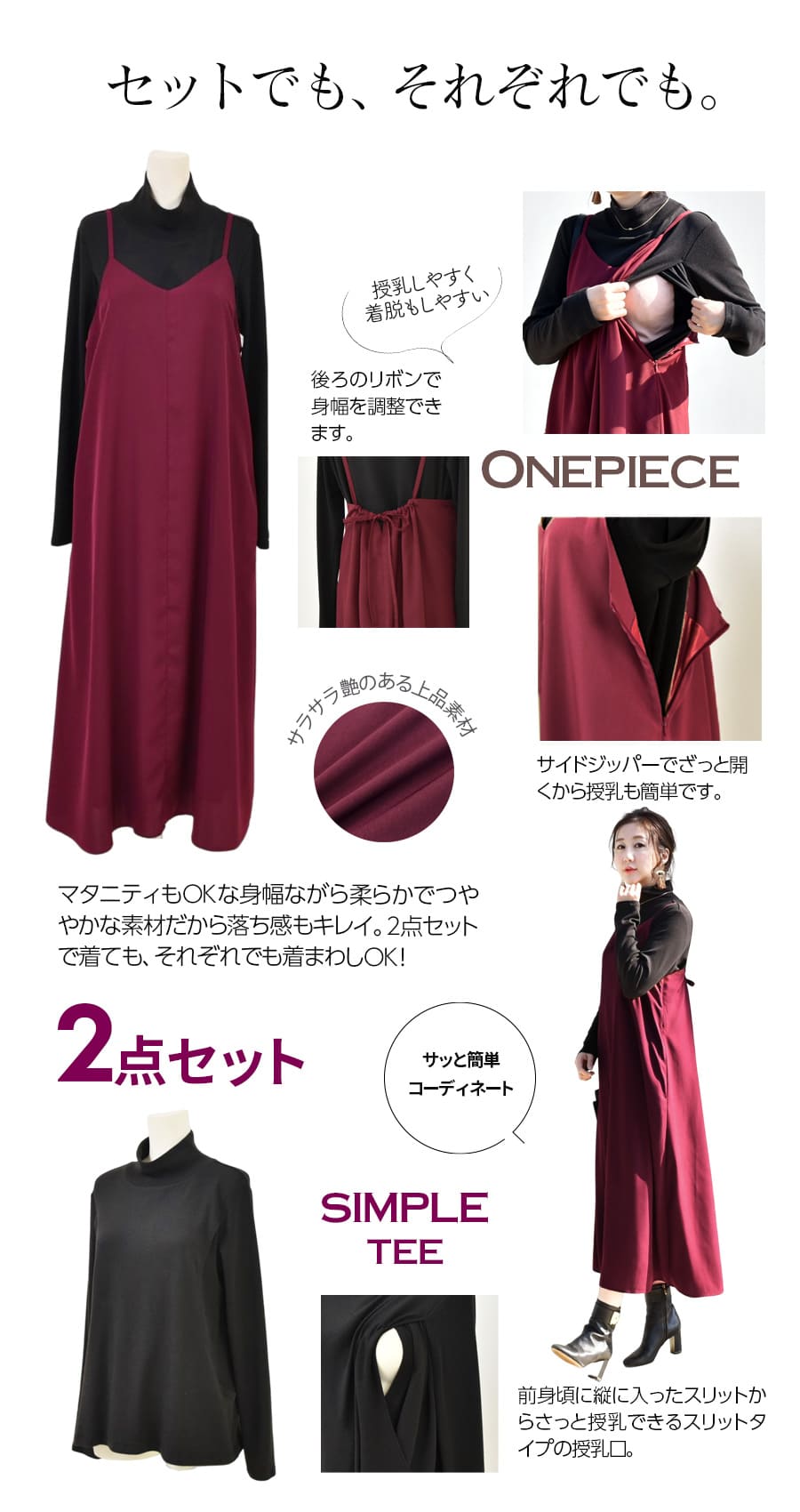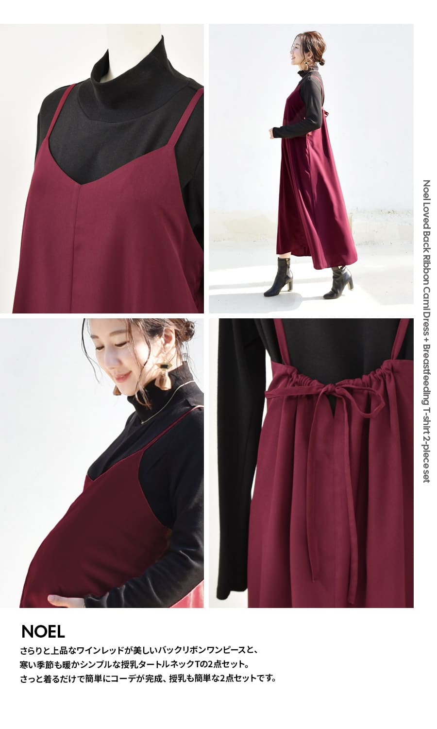 さらりと上品なワインレッドが美しいバックリボンワンピースと、寒い季節も暖かシンプルな授乳タートルネックTの2点セット。