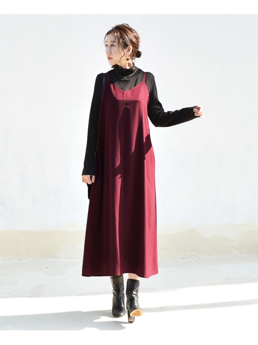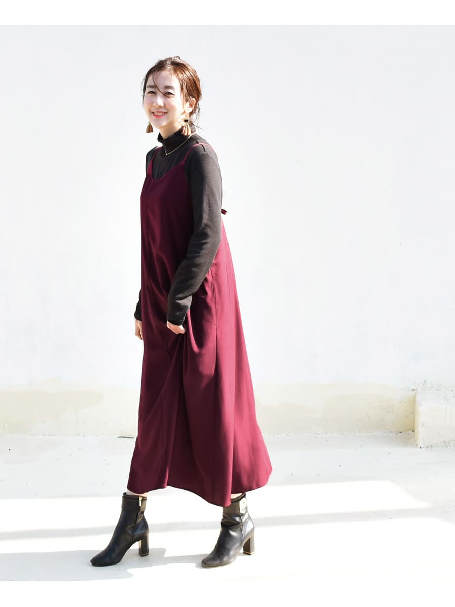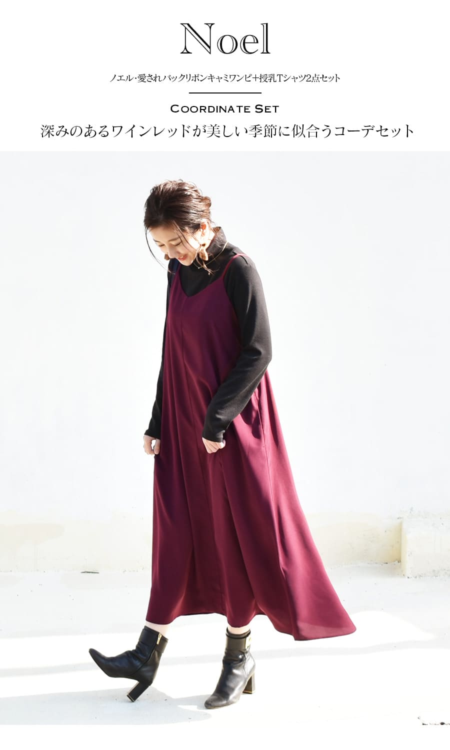 さらりと上品なワインレッドが美しいバックリボンワンピースと、寒い季節も暖かシンプルな授乳タートルネックTの2点セット。
