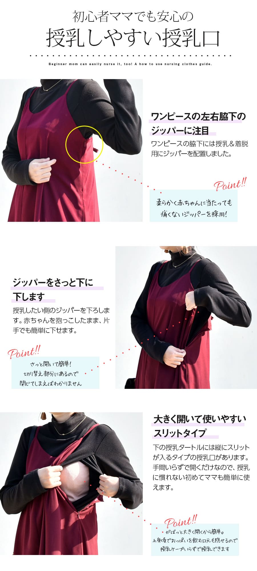 前身頃に縦にスリットを入れた授乳口は、授乳はじめてママでも手間いらずでガバっと開くから、本当に授乳しやすいデザイン。