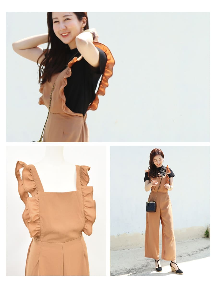 大きな存在感あるフリルが甘くて愛らしい大人の授乳ができる産後対応の上品サロペットです。