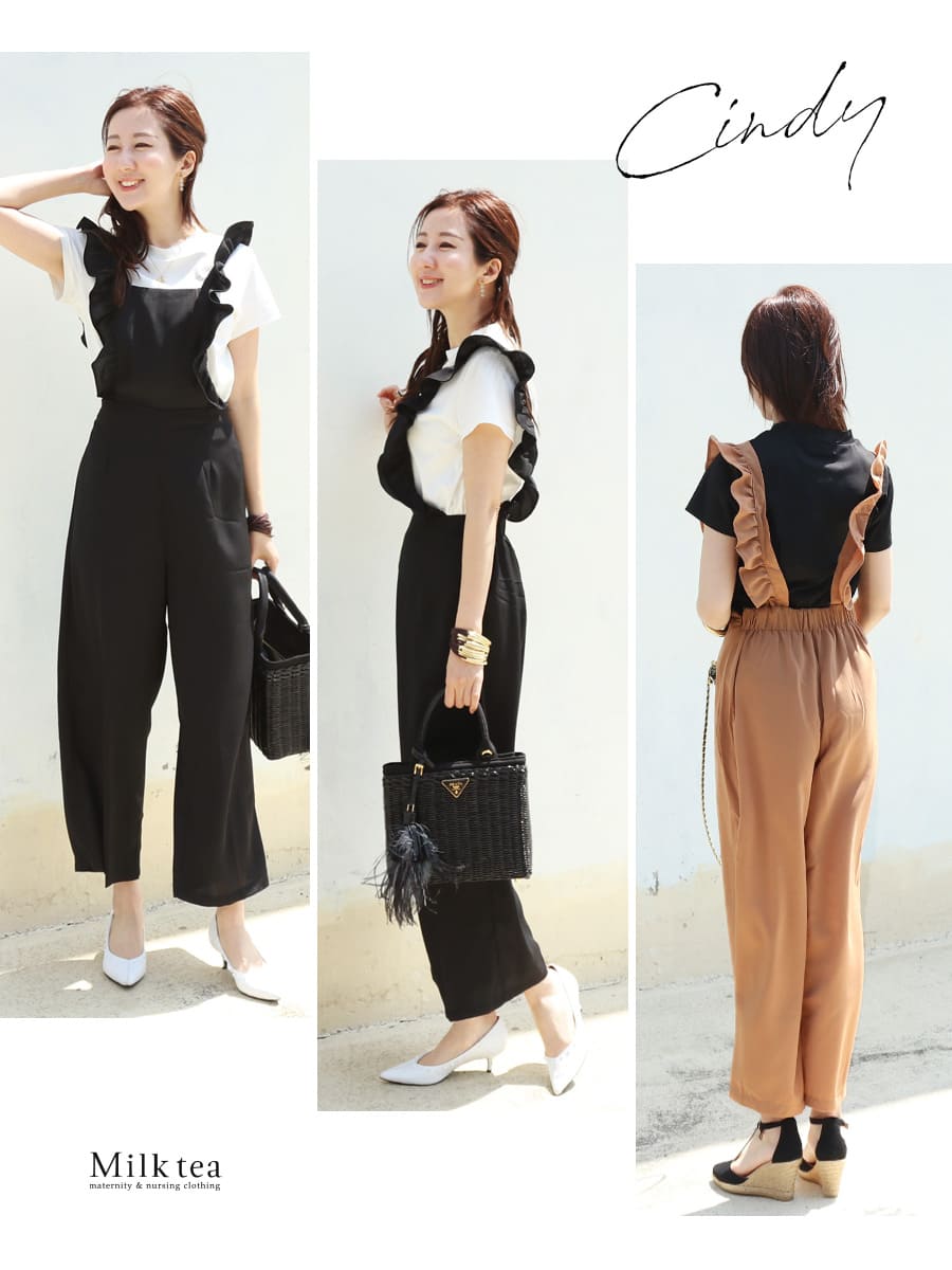 商品カテゴリ:授乳服 授乳 マタニティ マタニティ 妊娠 出産 妊婦 妊婦服 産前産後 出産準備 入院準備 産院 妊娠初期 妊娠中期 妊娠後期 レディース パンツ ボトムス 産後パンツ サロペット フリル 春 夏 秋 冬 オールシーズン 大人可愛い Milktea ミルクティー ミルクティ
