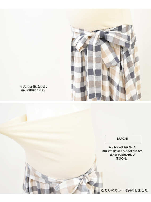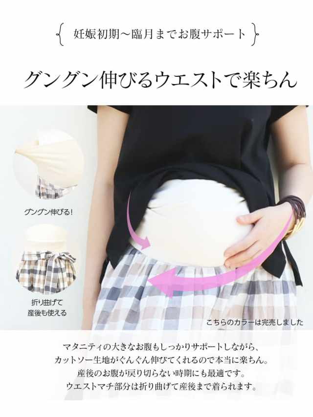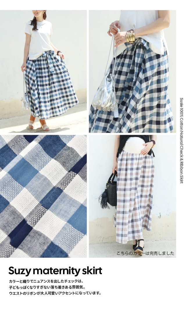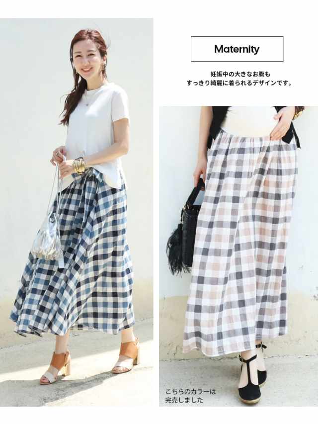ナチュラルで優しい風合いの綿100%のチェック素材をたっぷりつかった、身体にもデザインも優しいマタニティスカートです。