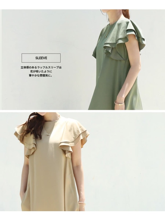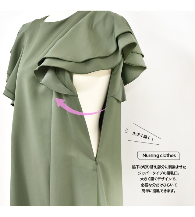 袖の華やかなラッフルディティールがとても可憐な授乳ワンピース。