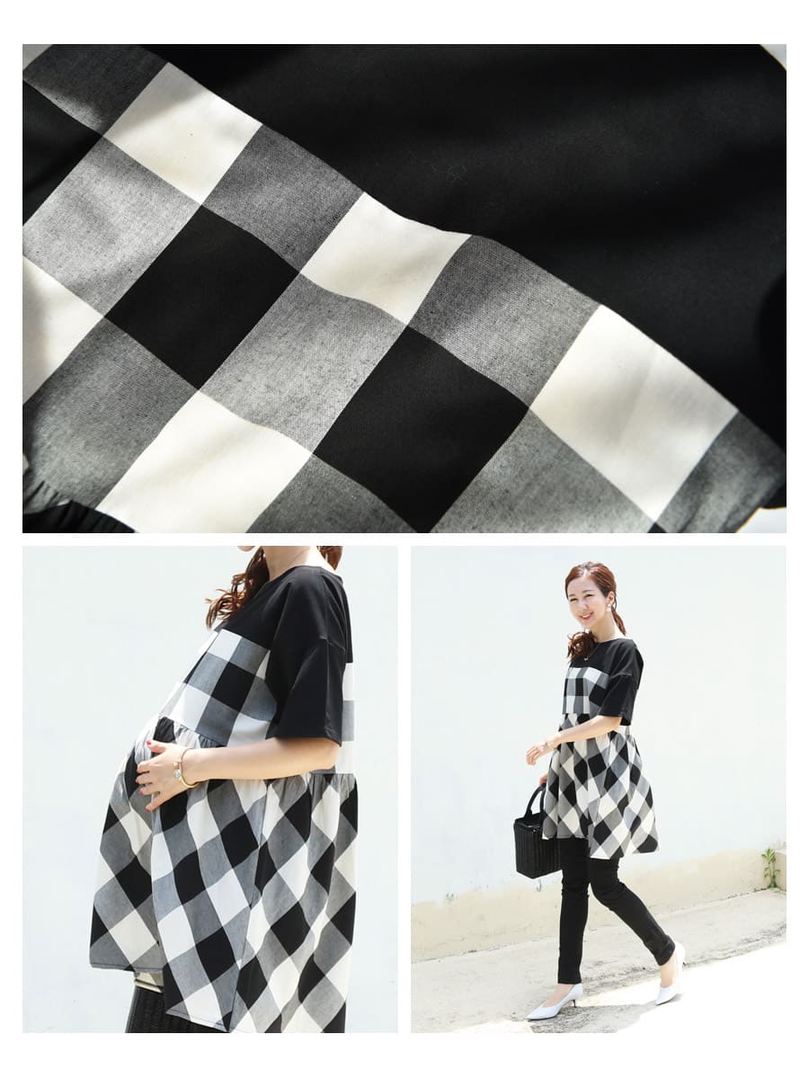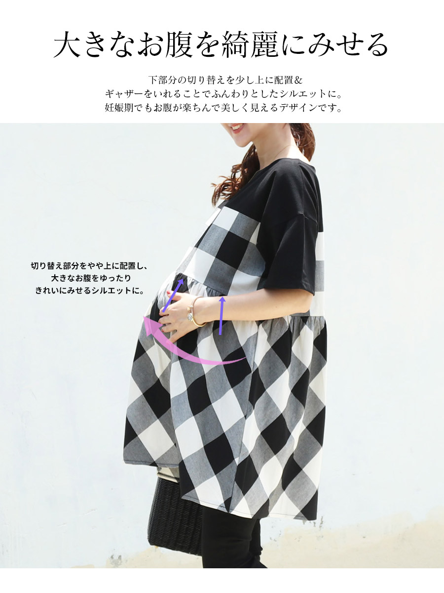 切り替え部分をやや上にすることで、大きなお腹に負担をかけることなく、ゆったり楽ちんなシルエットを実現します。