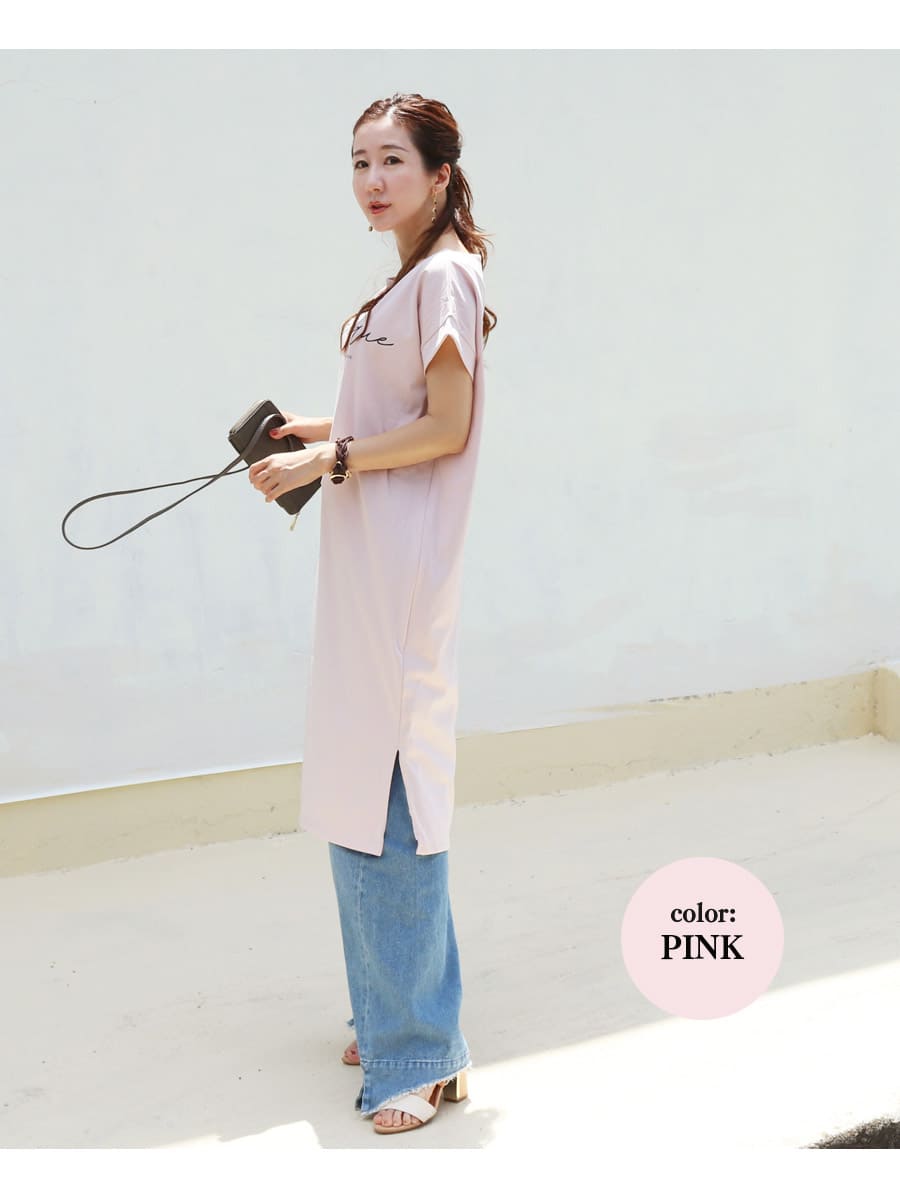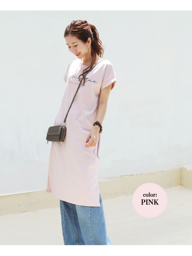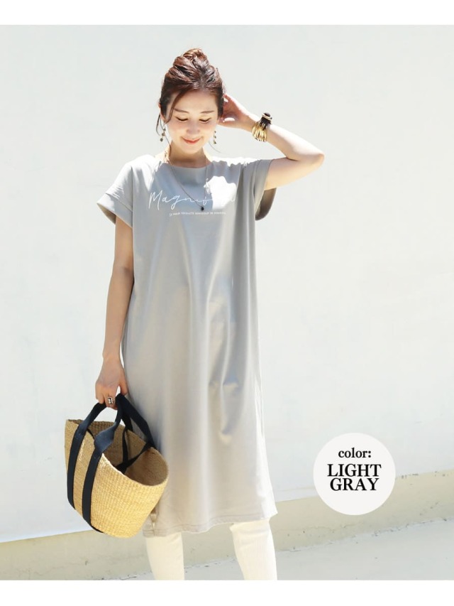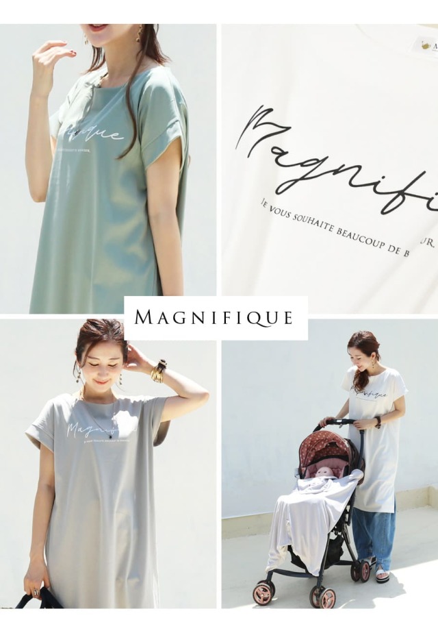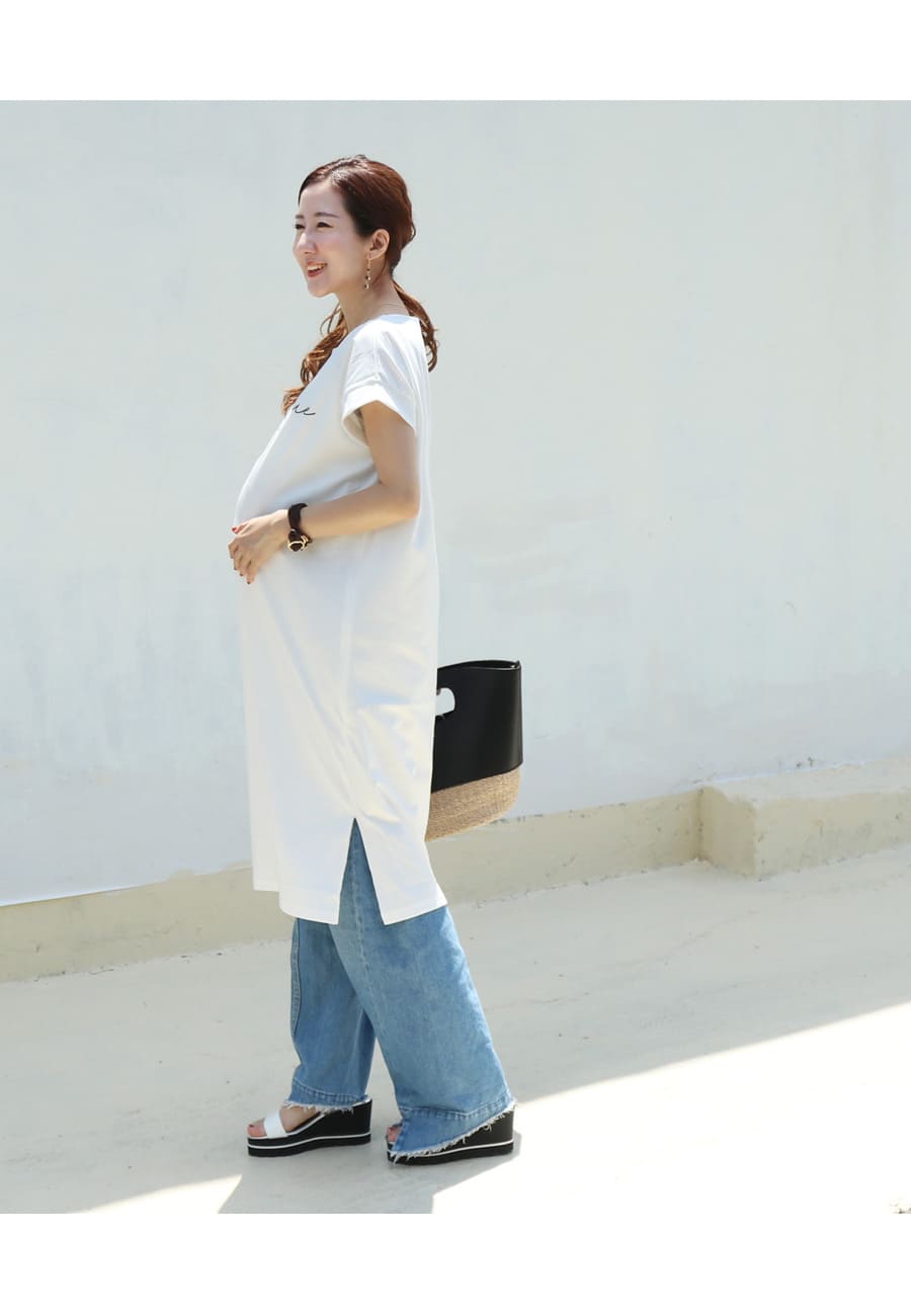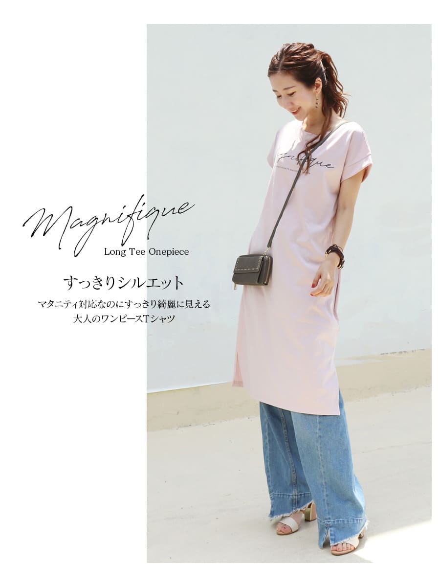 ドロップショルダーとすっきりしたシルエットで細見えするデザイン性の高いフレンチスリーブの授乳ロングTシャツワンピース。