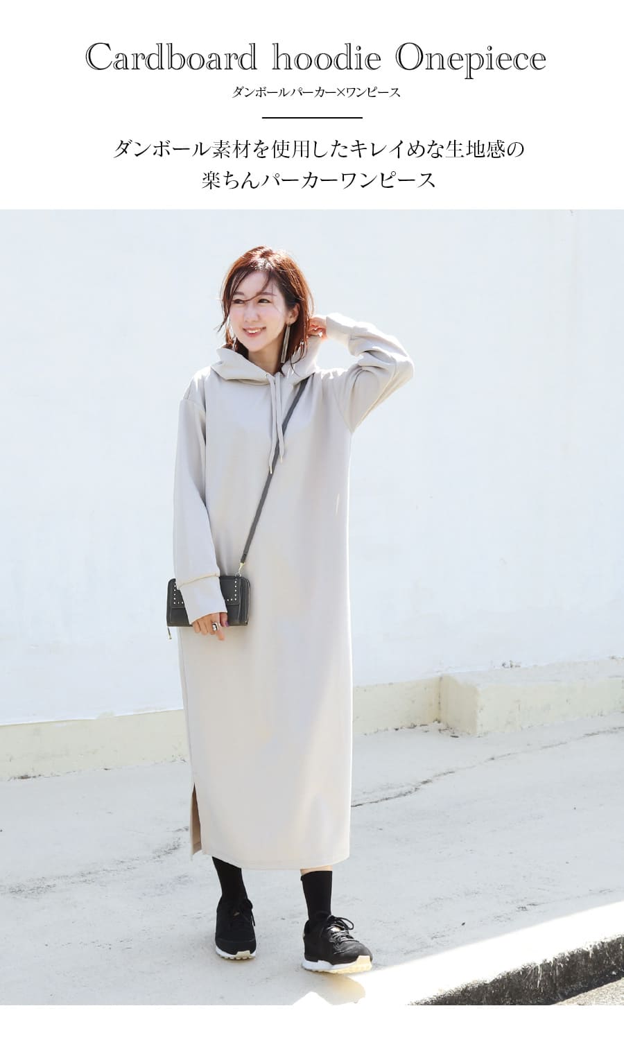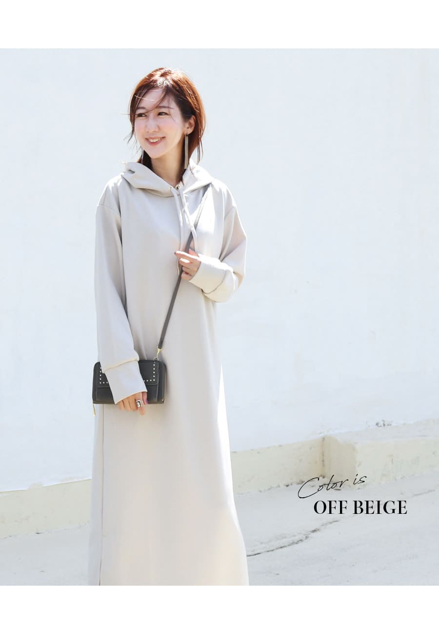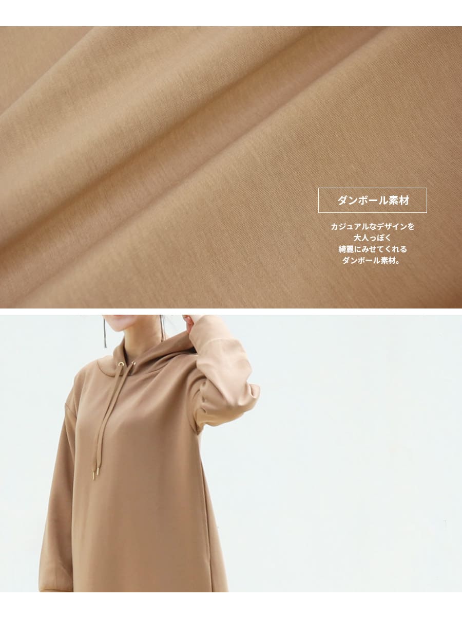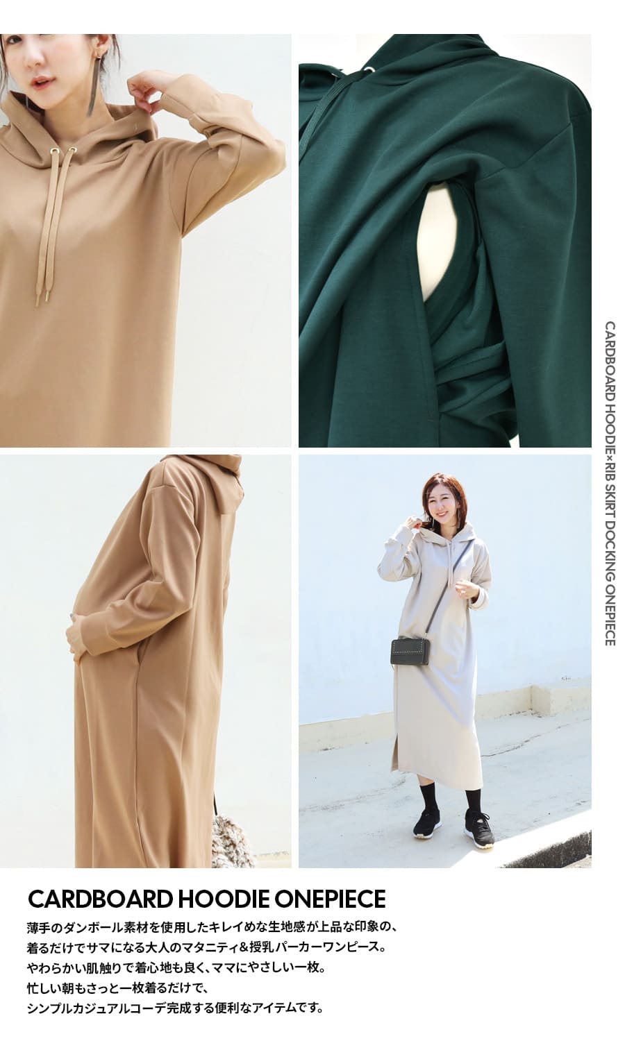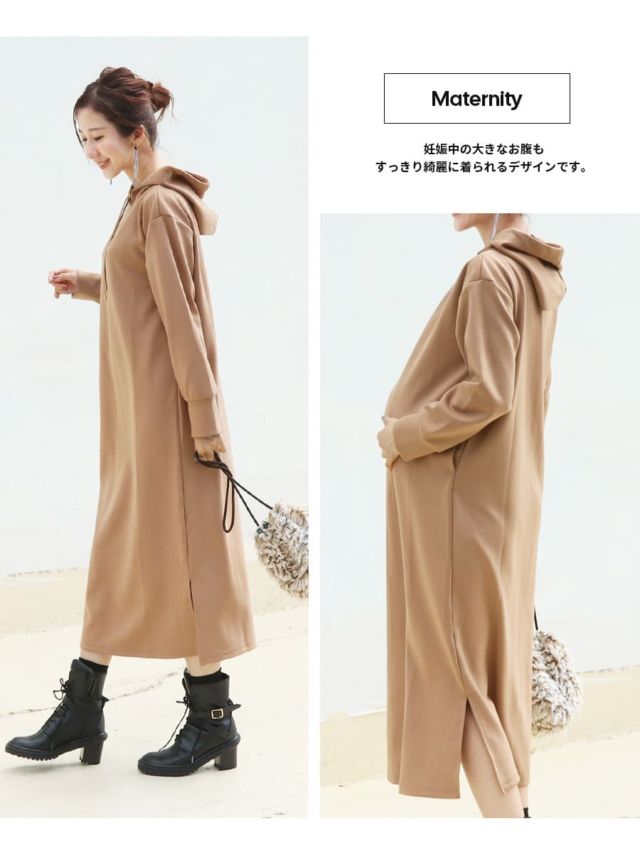 薄手のダンボール素材を使用したキレイめな生地感が上品な印象の、着るだけでサマになる大人のマタニティ&授乳パーカーワンピース。
