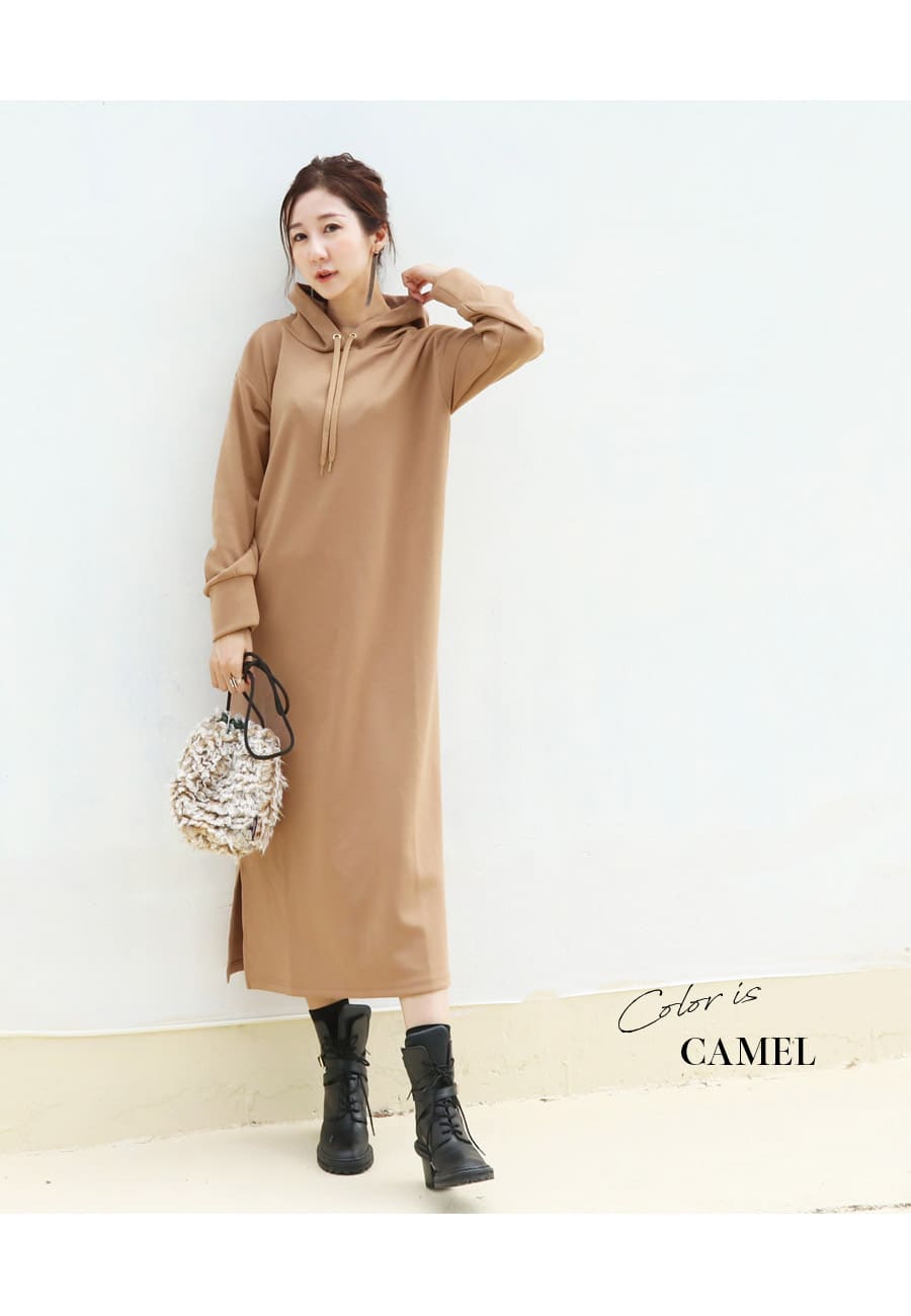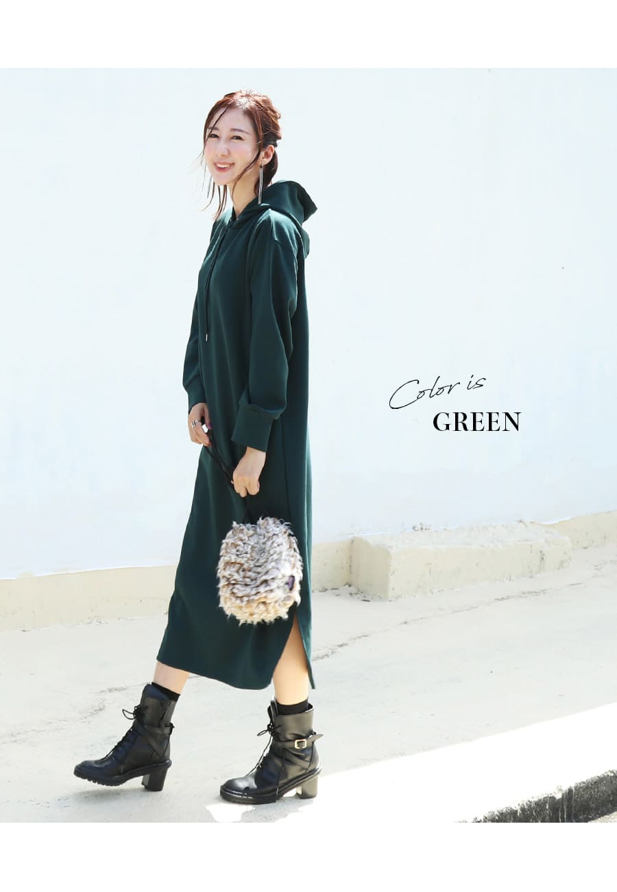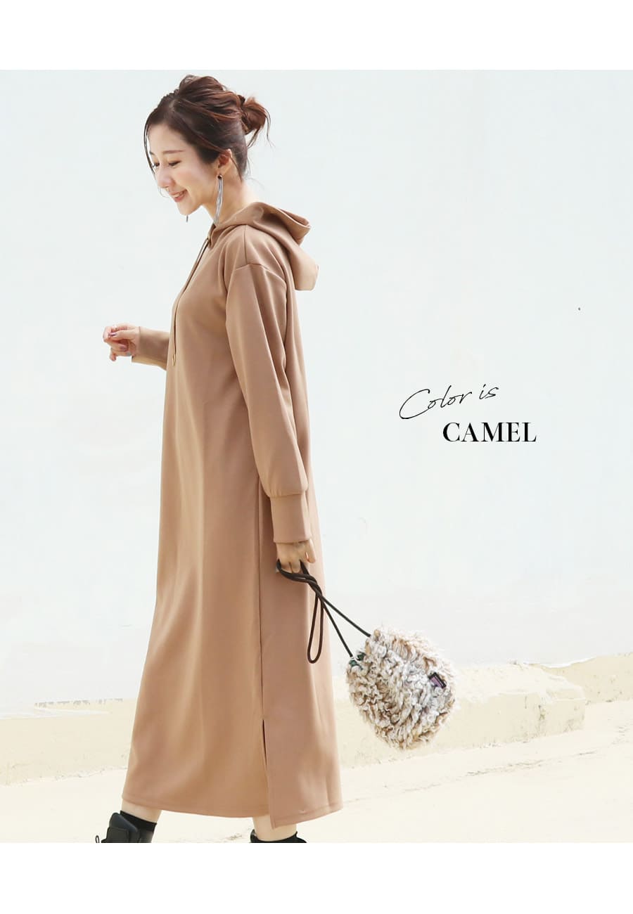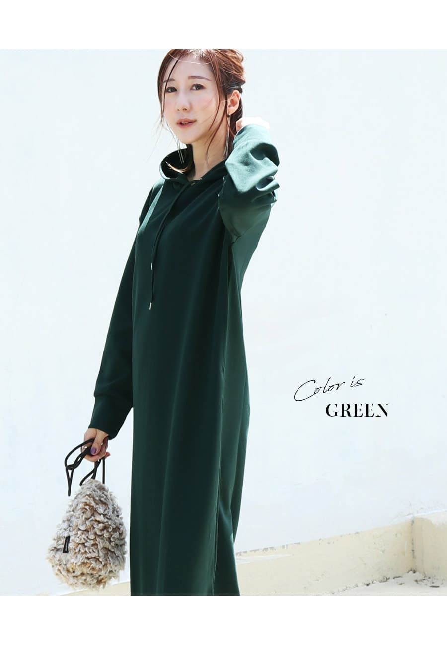 薄手のダンボール素材を使用したキレイめな生地感が上品な印象の、着るだけでサマになる大人のマタニティ&授乳パーカーワンピース。