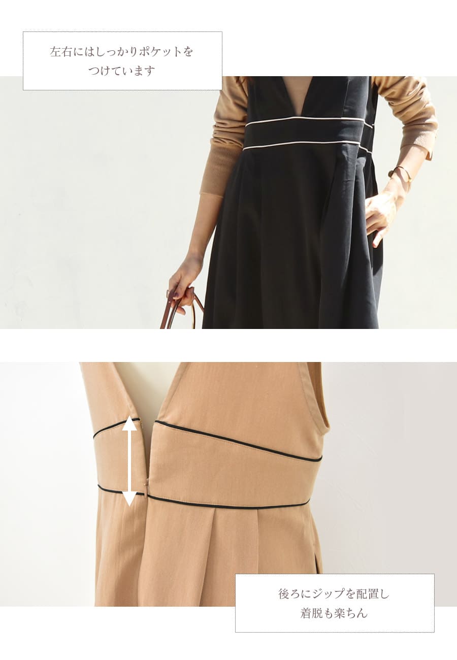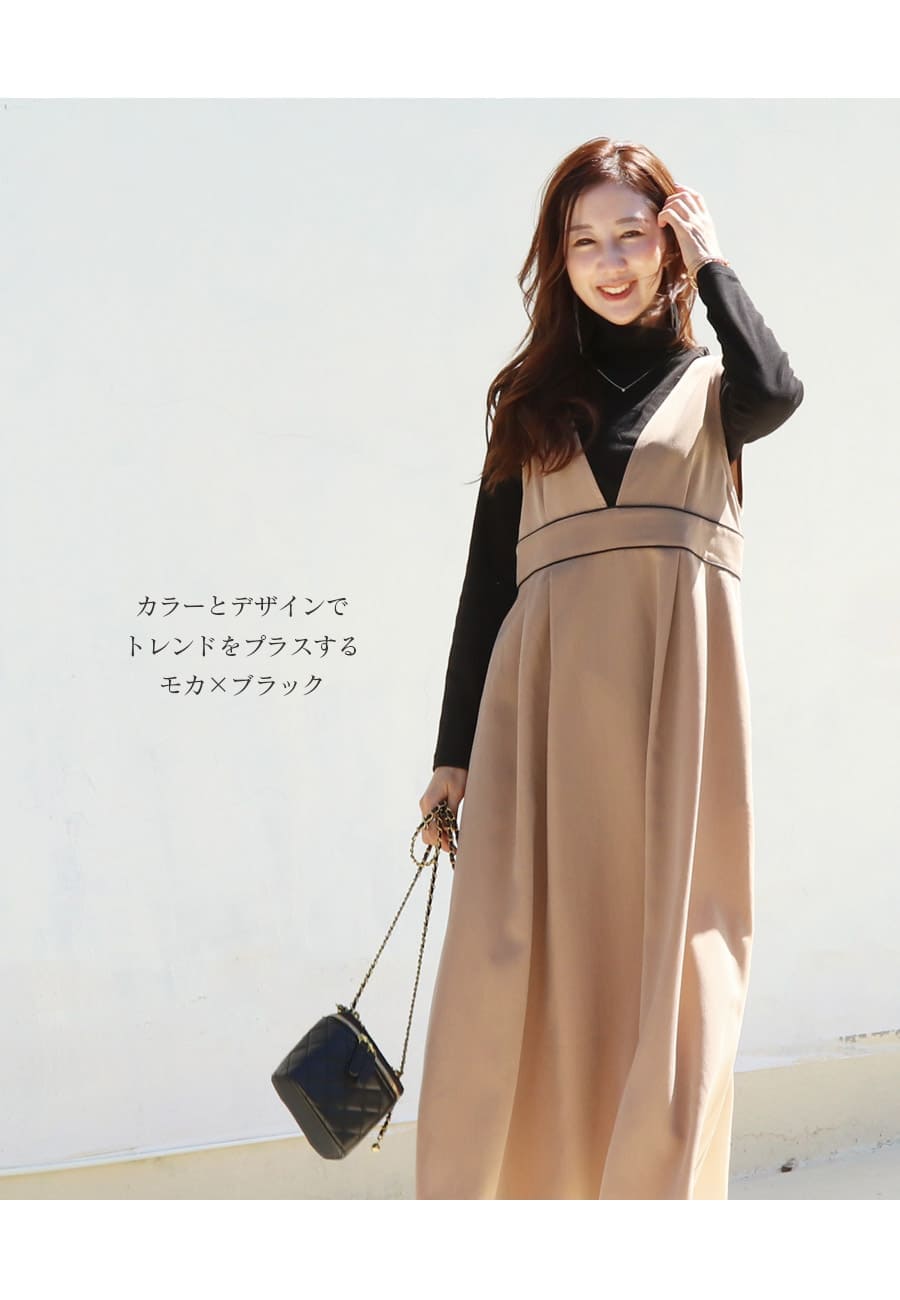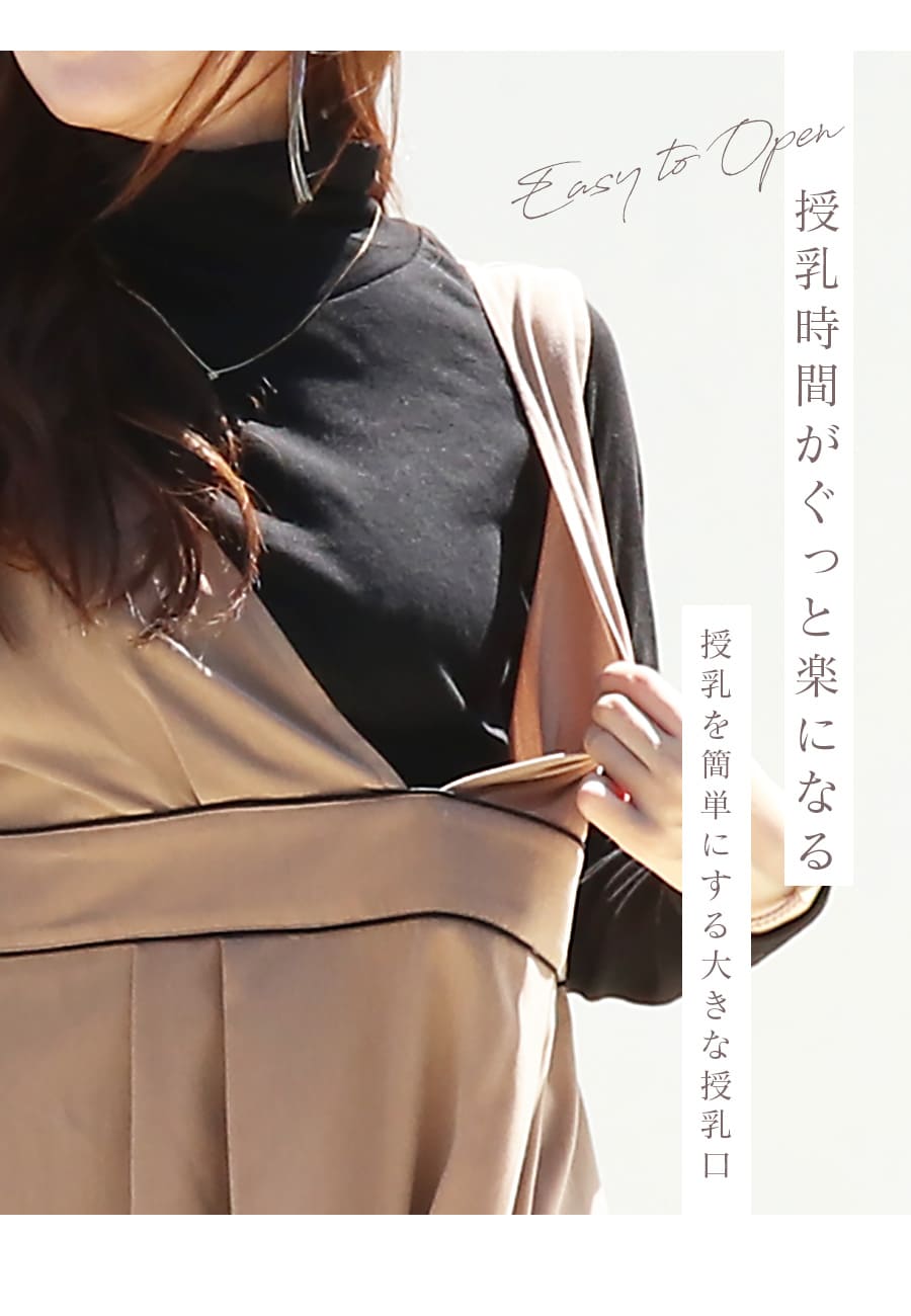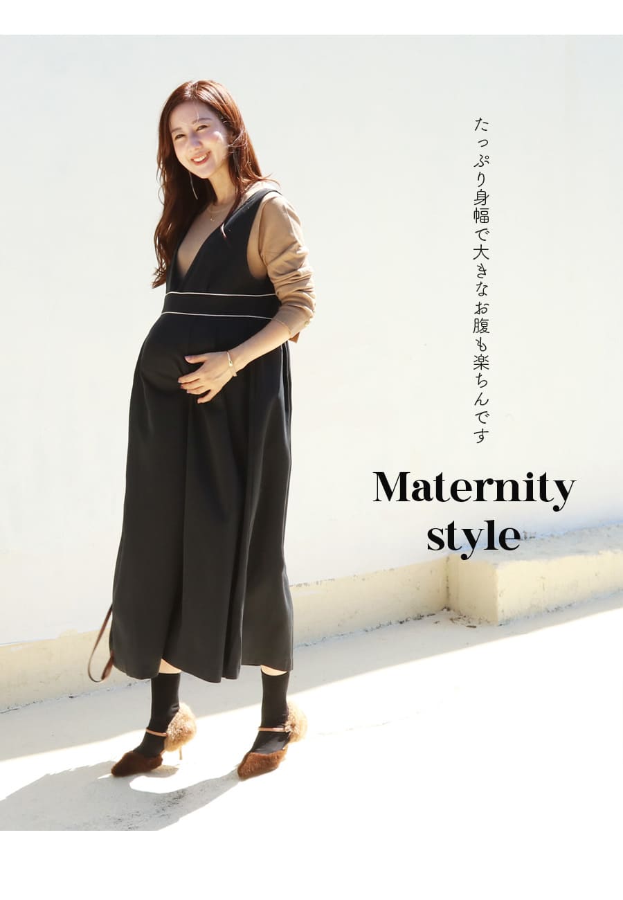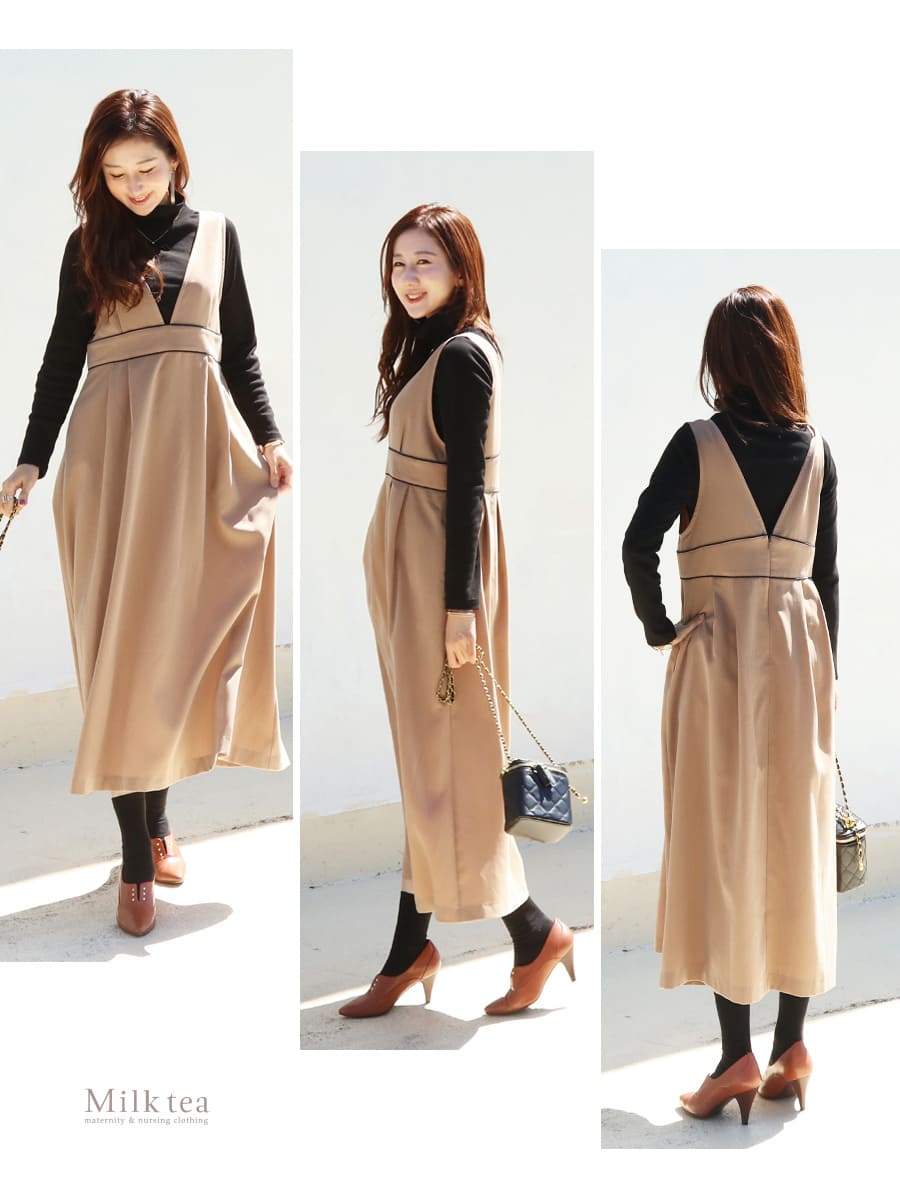 様々なトップスとのレイヤードスタイルを楽しめる、授乳&マタニティ対応レディな雰囲気のパイピングジャンパースカートです。