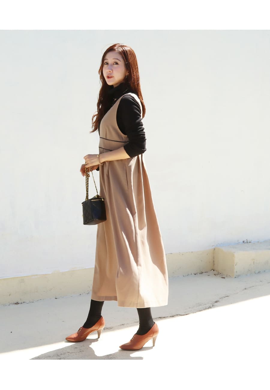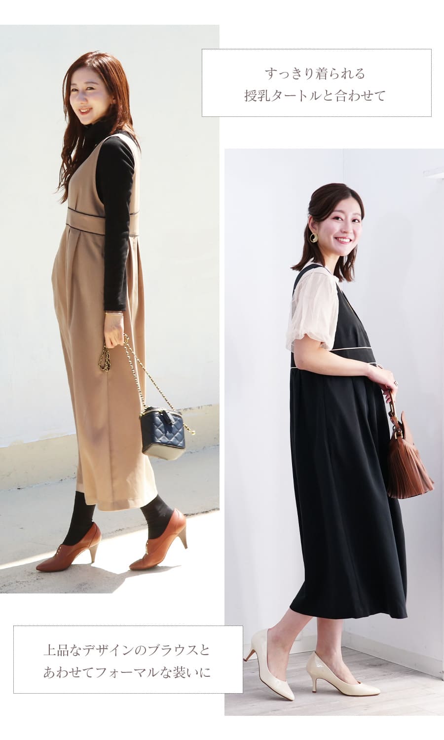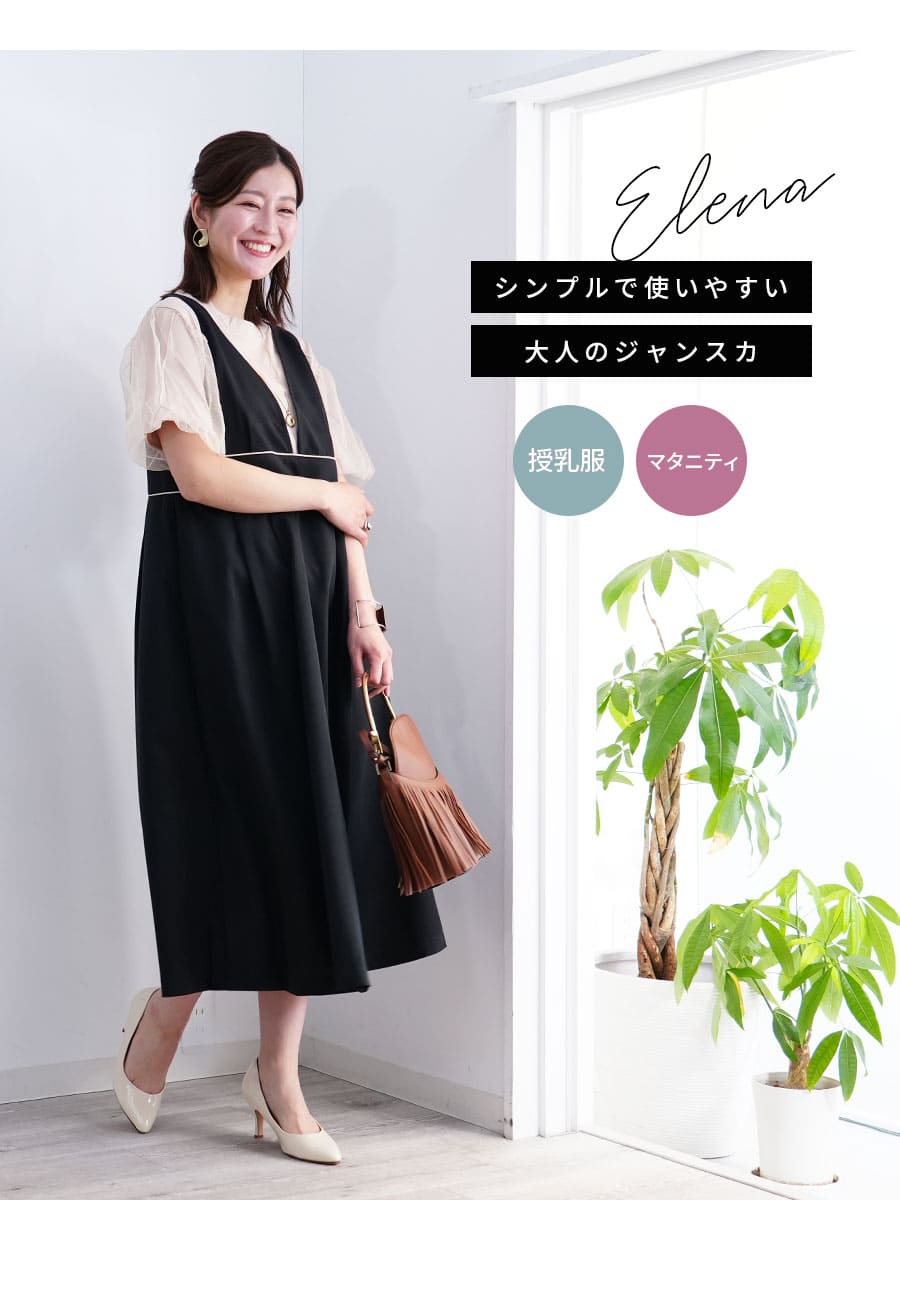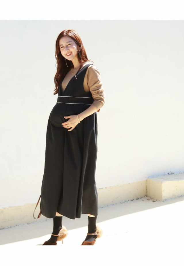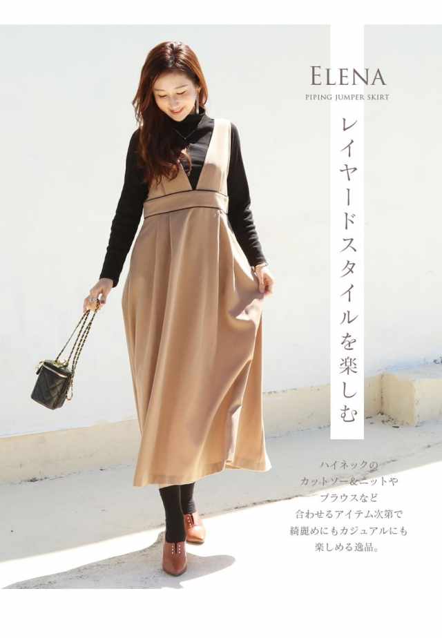 様々なトップスとのレイヤードスタイルを楽しめる、授乳&マタニティ対応レディな雰囲気のパイピングジャンパースカートです。