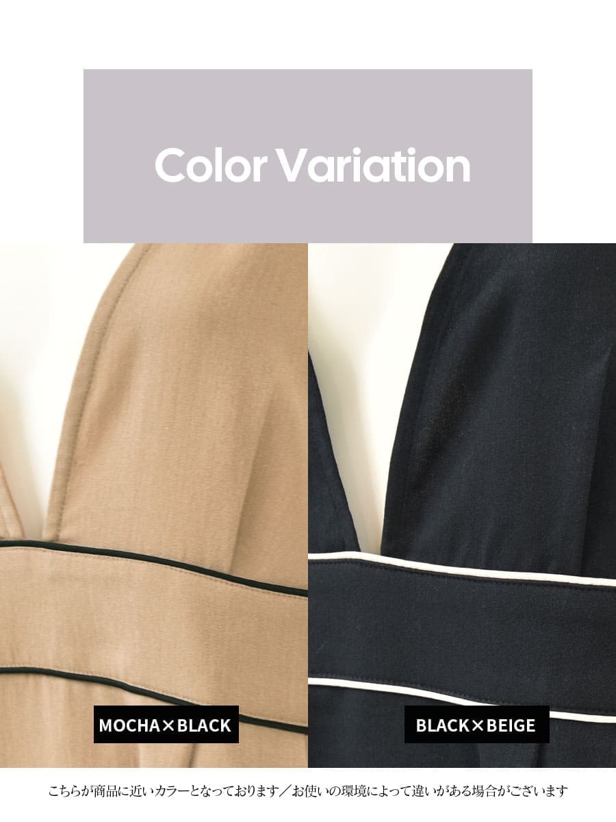 深めのV開きの襟元とウエストのパイピングラインで甘さを抑えた大人の女性らしい一枚。