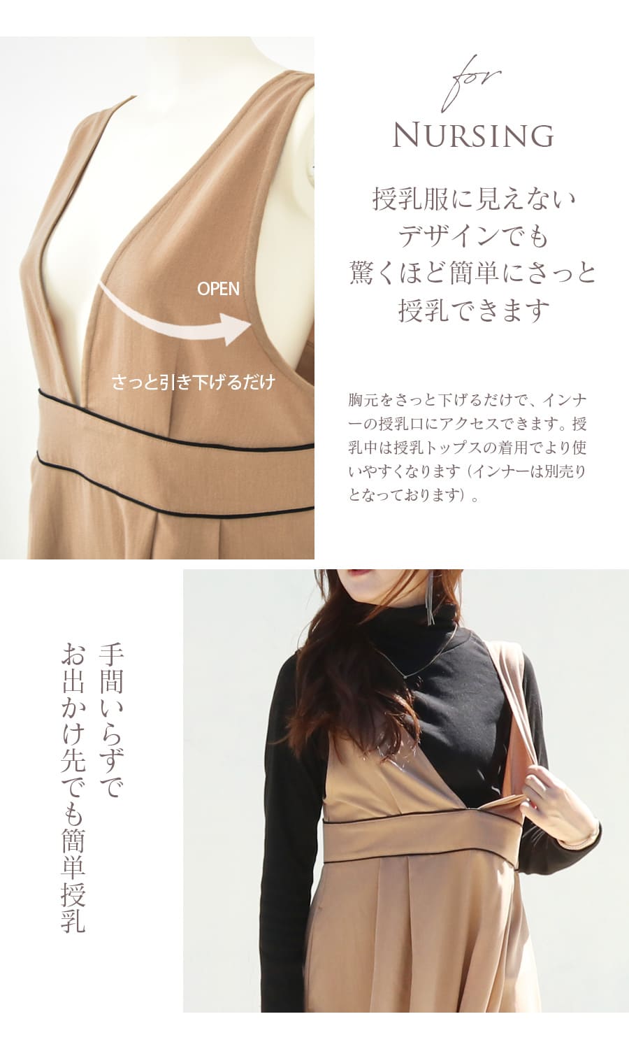 授乳はV開きの襟元をさっとずらすだけ。手間いらずで簡単に授乳できます。