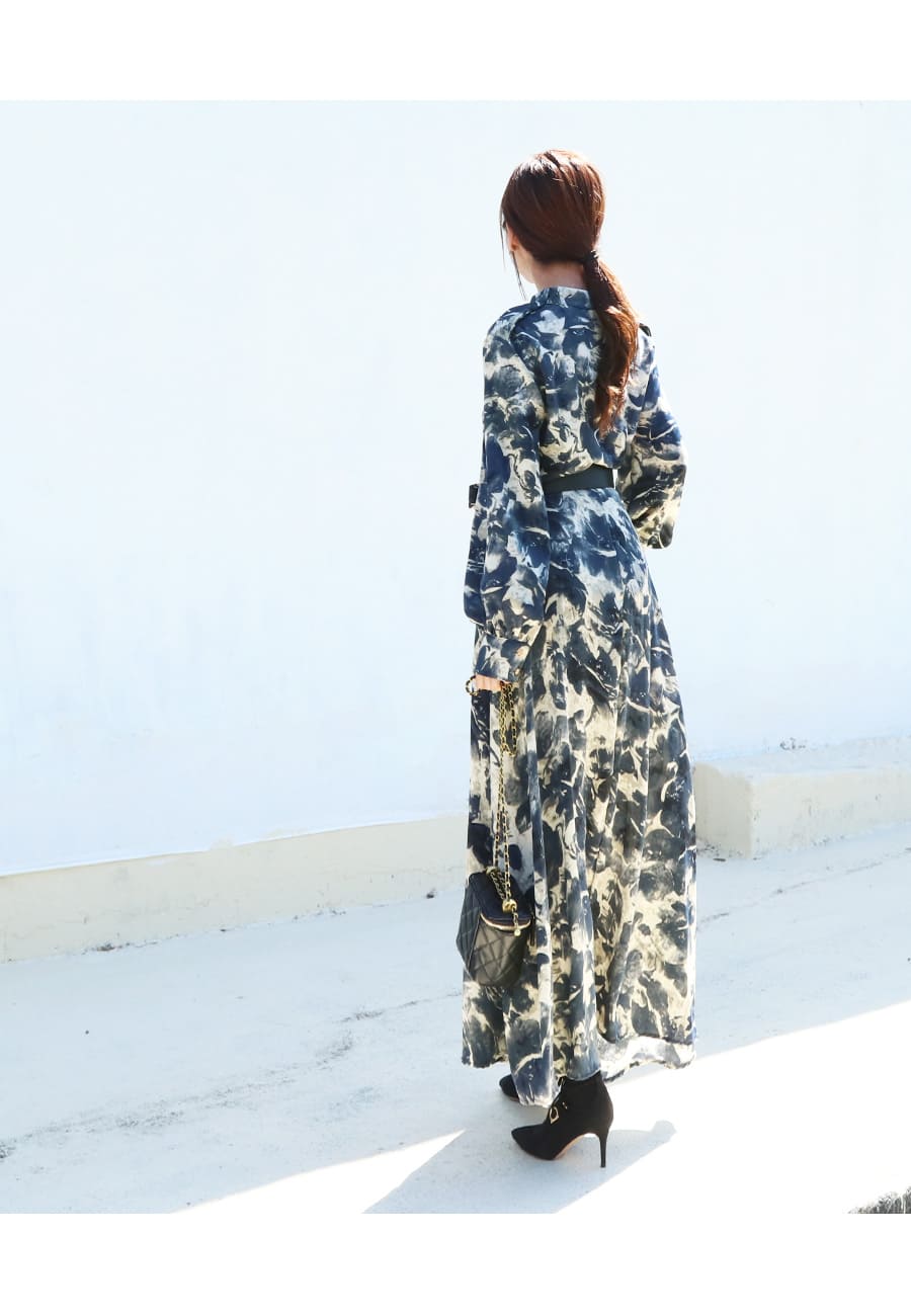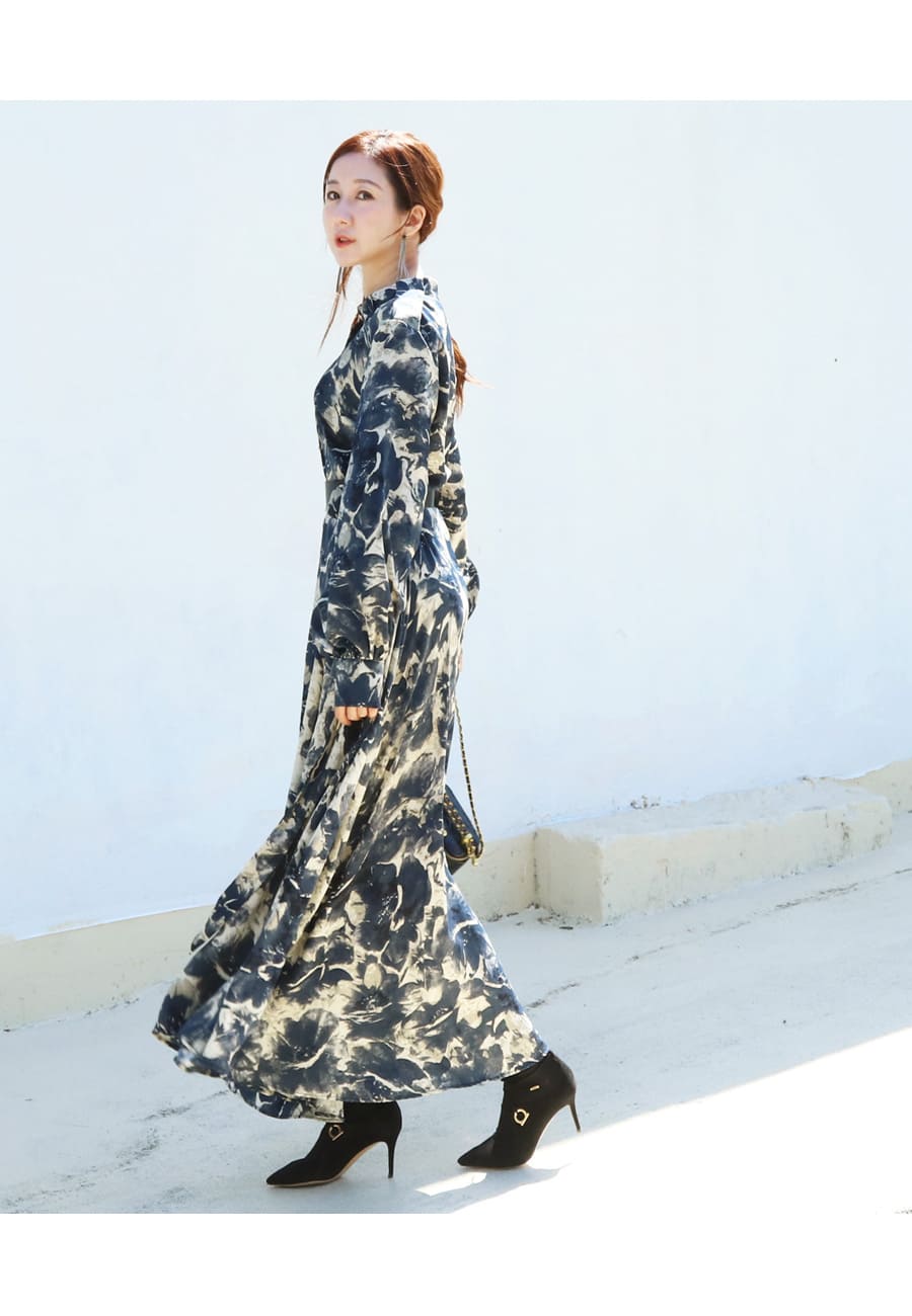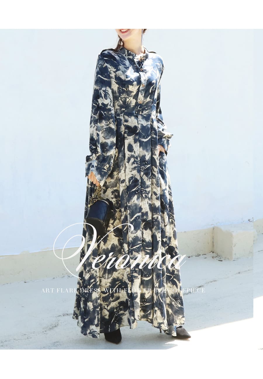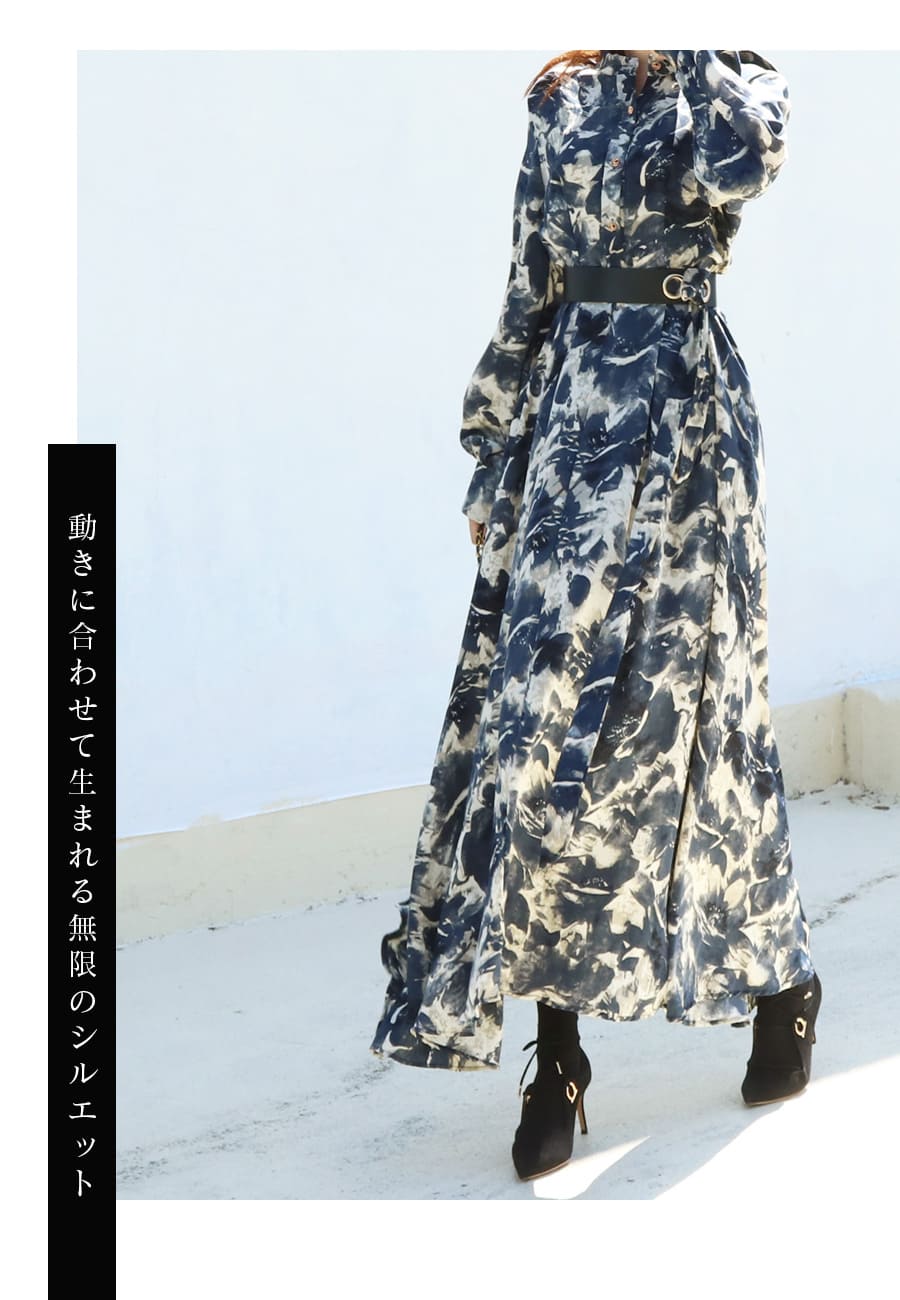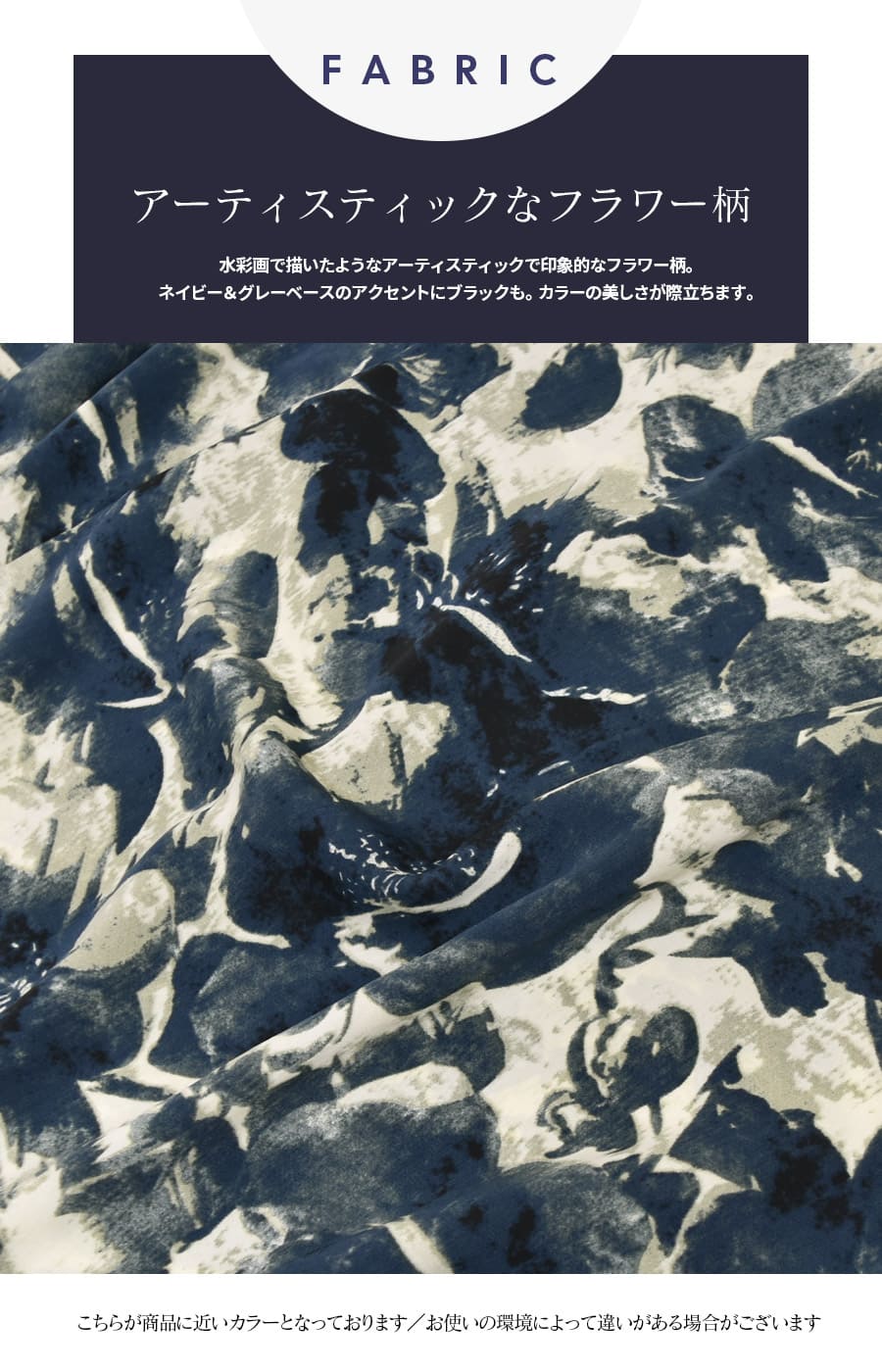 水彩画で描いたようなアーティスティックなフラワー柄をたっぷりと使ったフレアーシルエット。