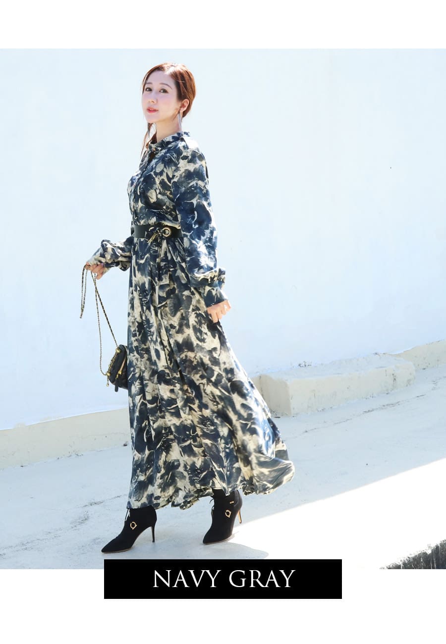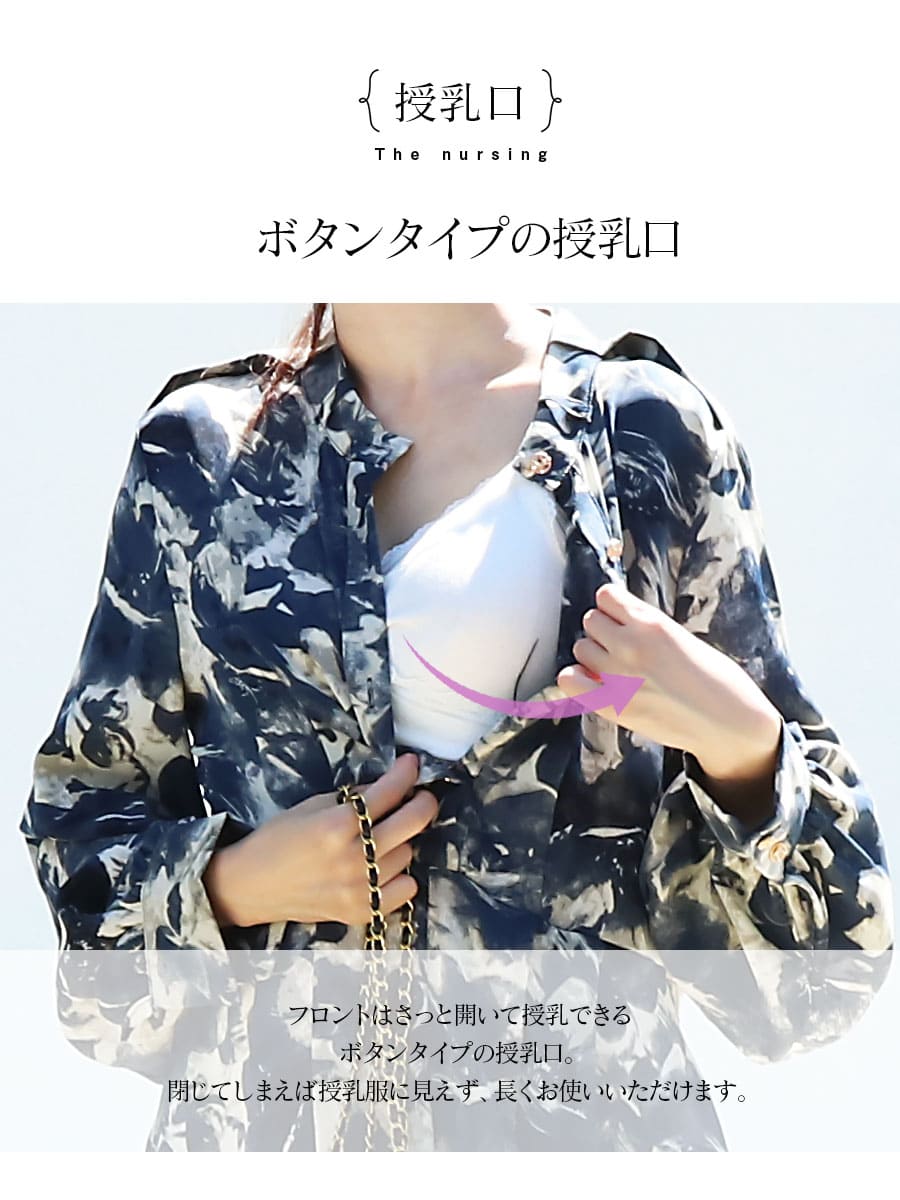 「とことんドラマティックな授乳ワンピース」 一枚でぐっと絵になる、存在感際立つ授乳ワンピースです。 水彩画で描いたようなアーティスティックなフラワー柄をたっぷりと使ったフレアーシルエット。 動くたびに綺麗に広がる無限のシルエットに思わずうっとりしてしまうデザインです。