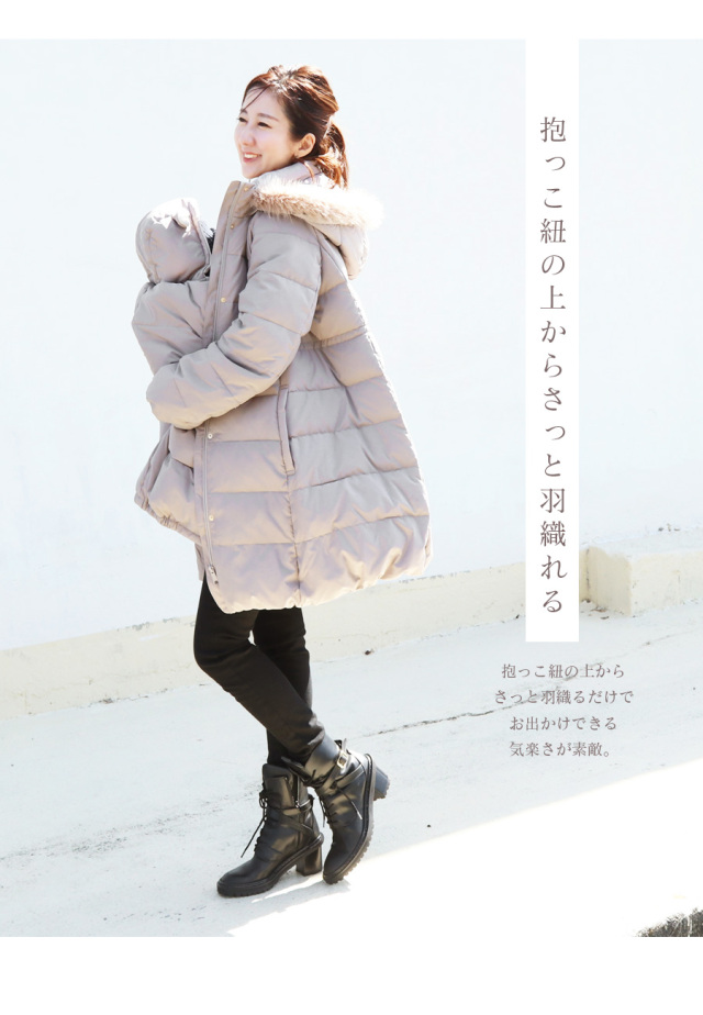 「暖かい空気をまとったような、軽くて、ふかふかな着心地」 ダウン70%&フェザー30%を使った、暖かくて軽い5WAYで使えるママコート。 「前抱っこ」「おんぶ」も自由自在。 付属のケープを使えばママが嬉しい5通りの使い方で、赤ちゃんとの冬をしっかりサポートしてくれます。