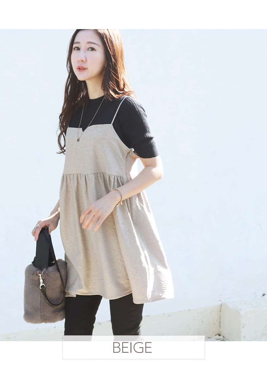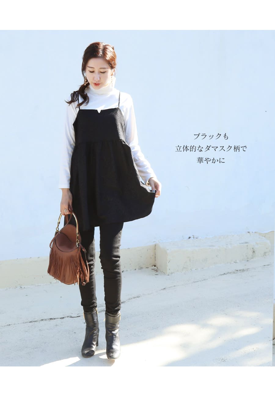 ダマスク模様を立体的に表現したニュアンスのある上品なファブリックを使った、フレアーシルエットがフェミニンな授乳&マタニティ対応キャミソールトップス。