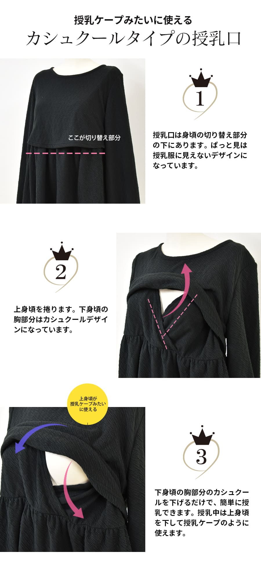 ・授乳は切り替え部分をさっと上げて、下身頃のカシュクールデザインの胸元からさっと開くだけのカシュクールタイプ。