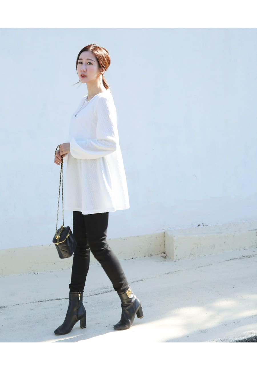 ・ふっくらとした袖&フレアーデザインが二の腕や腰回りなど気になる部分をカバーしてくれます。