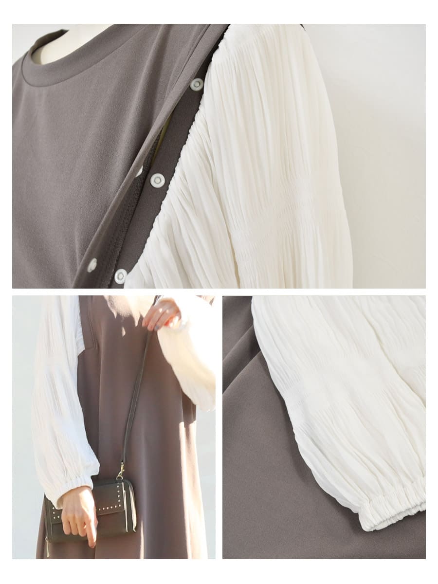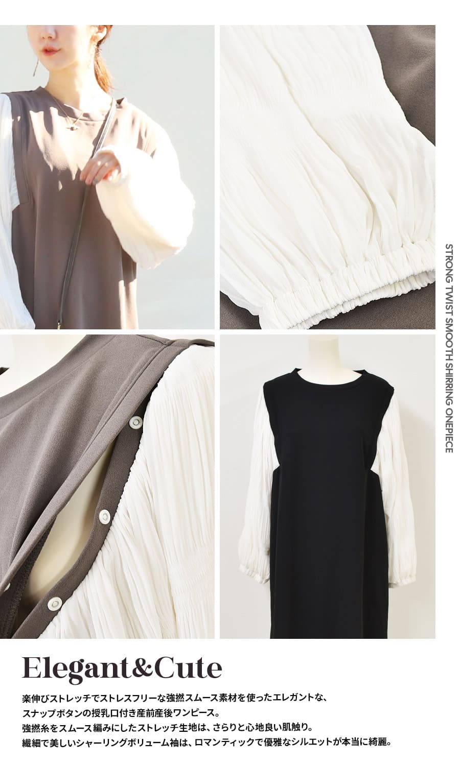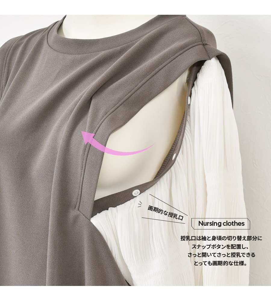 楽伸びストレッチでストレスフリーな強撚スムース素材を使ったエレガントな、スナップボタンの授乳口付き産前産後ワンピース。