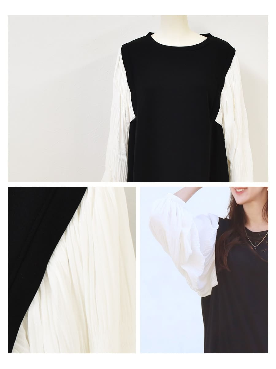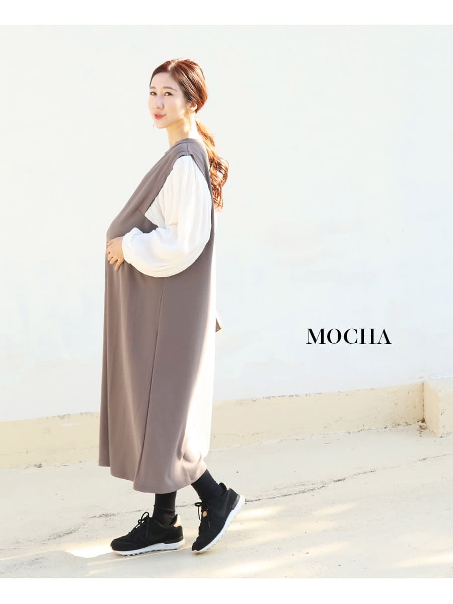 エレガントな見え感ながら、着てみるとカットソー生地ならではの柔らかさとストレッチ性があり、産前産後を通して楽ちんに過ごせます。