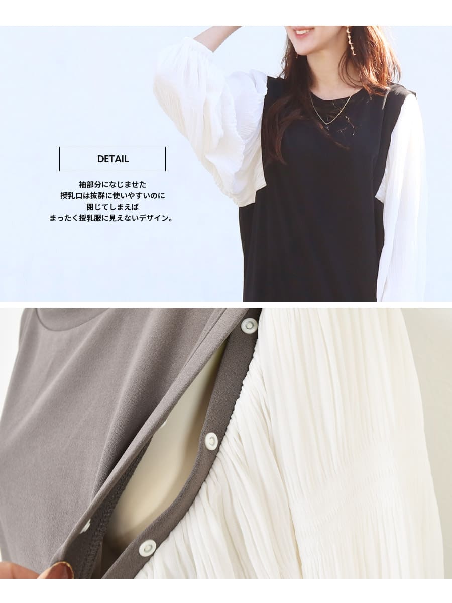 袖の切り替え部分になじませたスナップボタンタイプの授乳口付きで、とっさの授乳も簡単にでき、閉じてしまえば授乳服には見えないので、産後までお使いいただけます。