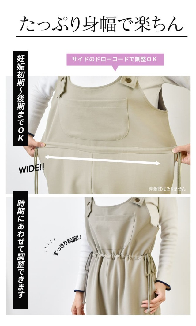 約105cmまでOKなウエストはドローコードで調整できるから、産前産後まで時期を問わず綺麗なシルエットが実現。