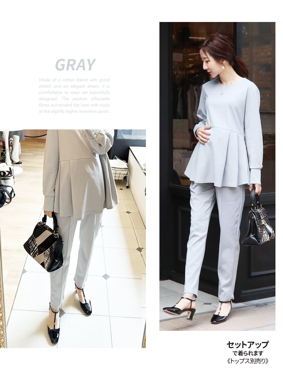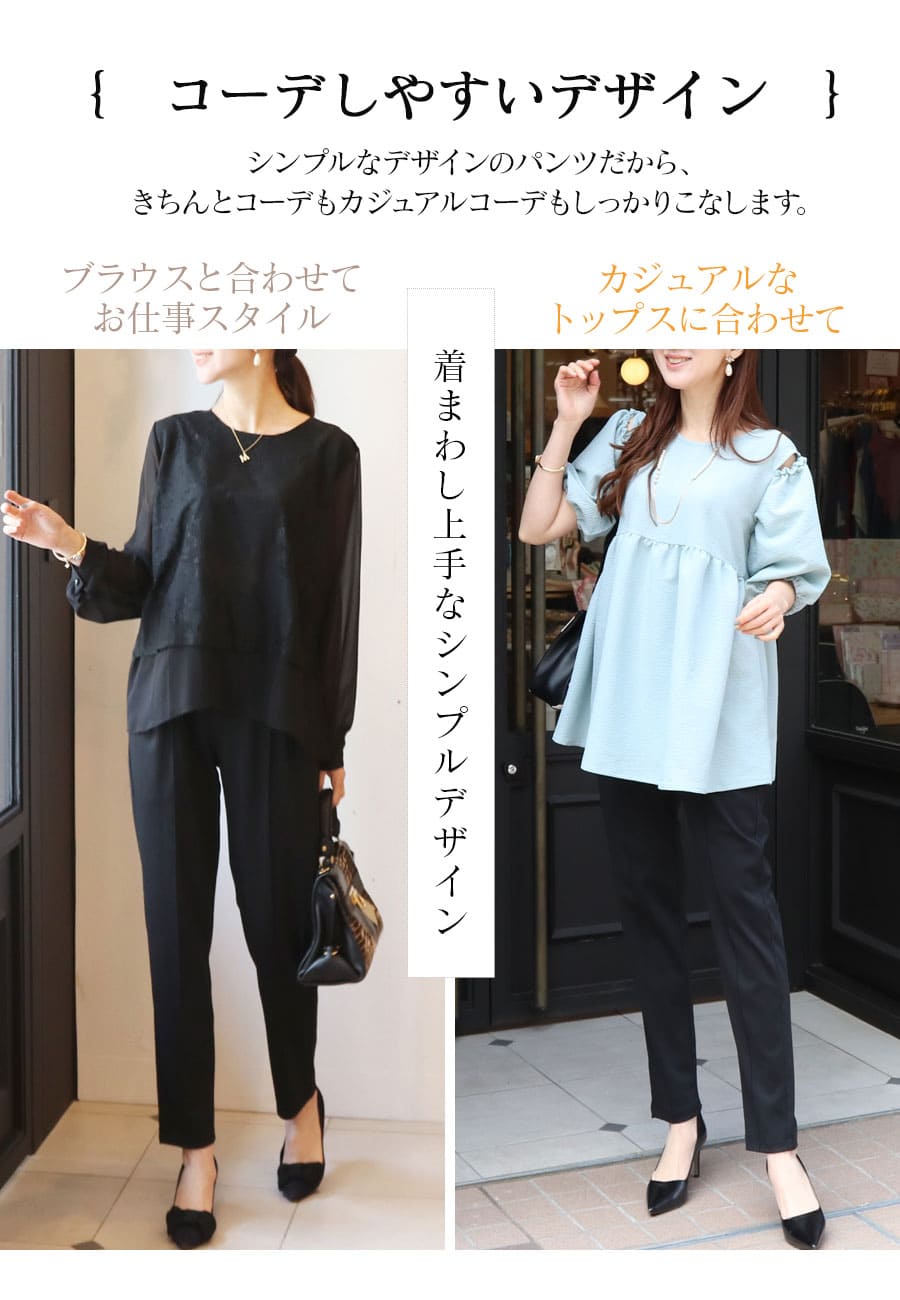 シンプルなデザインと綺麗なシルエットで美脚を実現する、産前産後が選べる!テーパードパンツです。