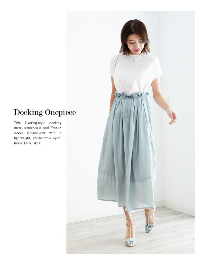 涼し気なフレンチスリーブのカットソーと、軽い着心地のナイロン生地フレアスカートを合わせた《マタニティ・授乳対応》重ね着風ドッキングワンピースです。