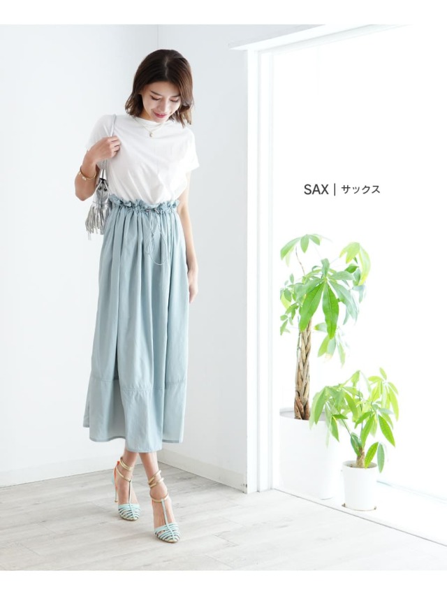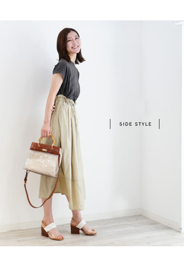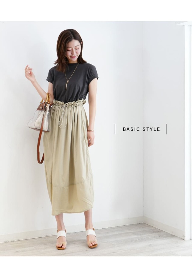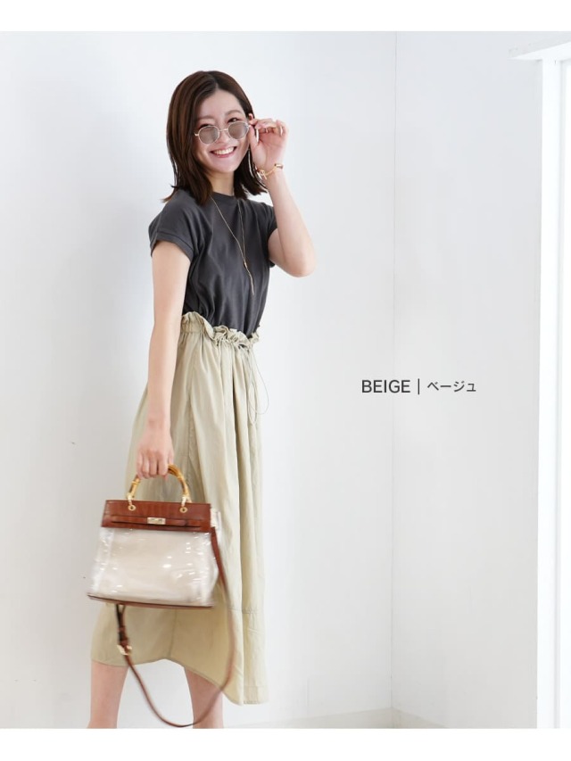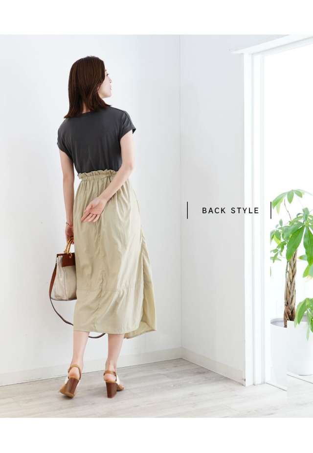 スカート部分は綺麗なハリのあるナイロン素材で、大人っぽい雰囲気の中にもワーク感のあるトレンドライクなデザインに。