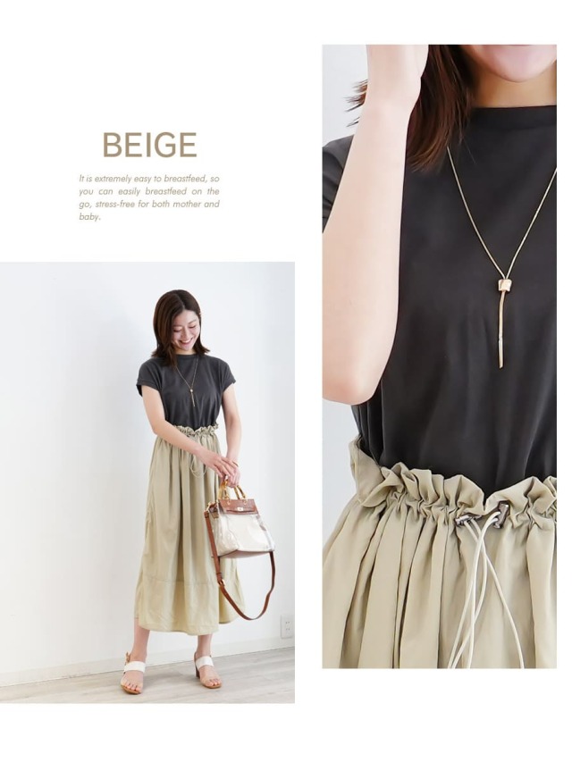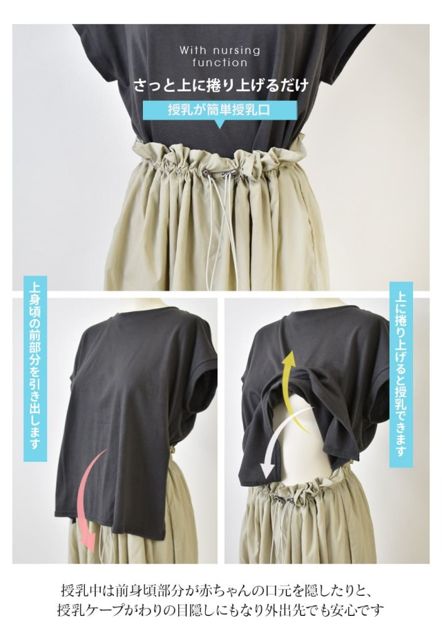 トップス部分の裾を引き出すだけで簡単に授乳できる上に、身幅の裾が授乳ケープ替わりの目隠しにも。