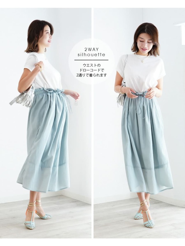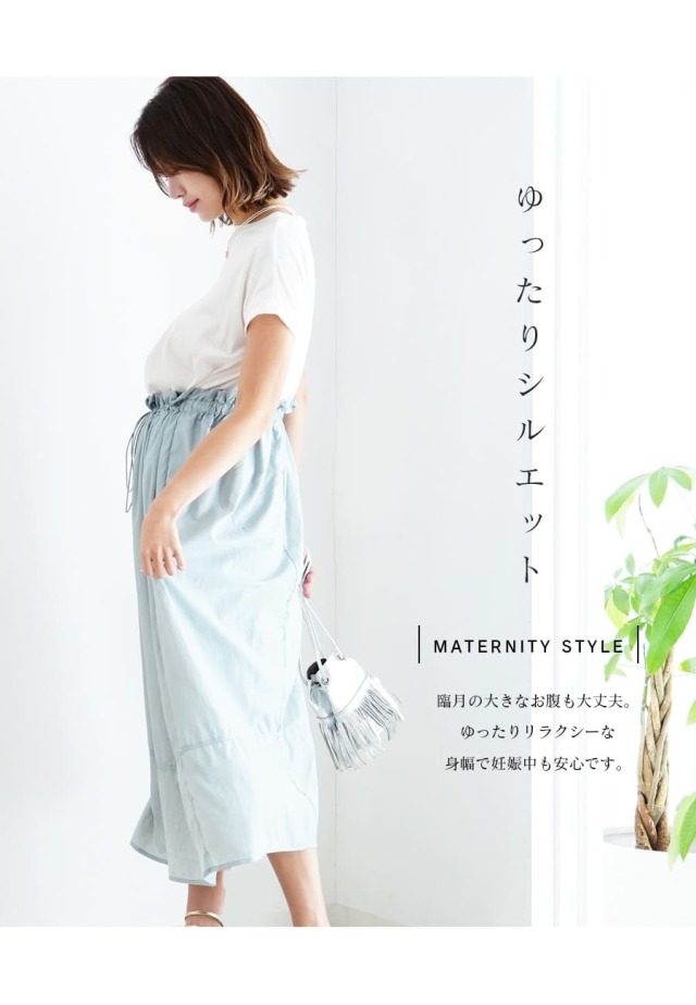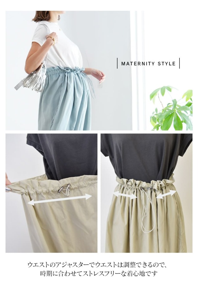 大きなお腹でも楽ちん&安心の約100cmほどのウエスト部分にドローコードを使い、大きくなるお腹&身体の変化に合わせて調整OK。
