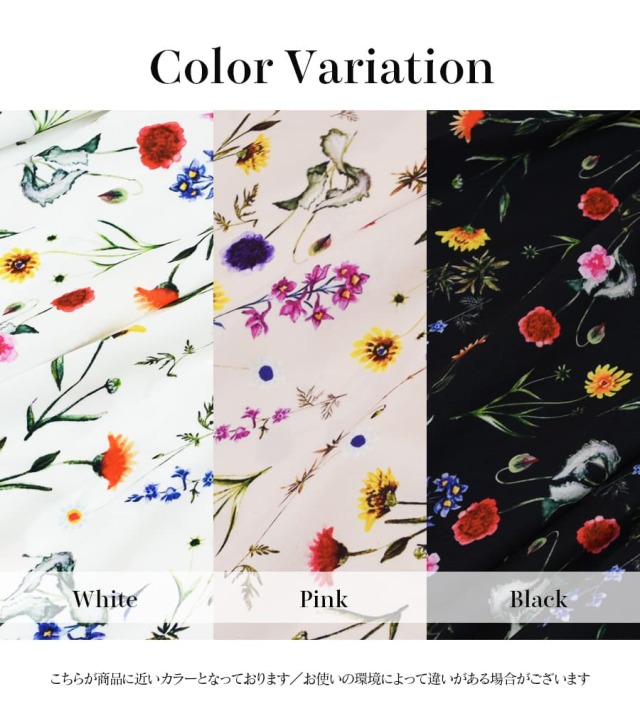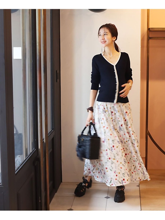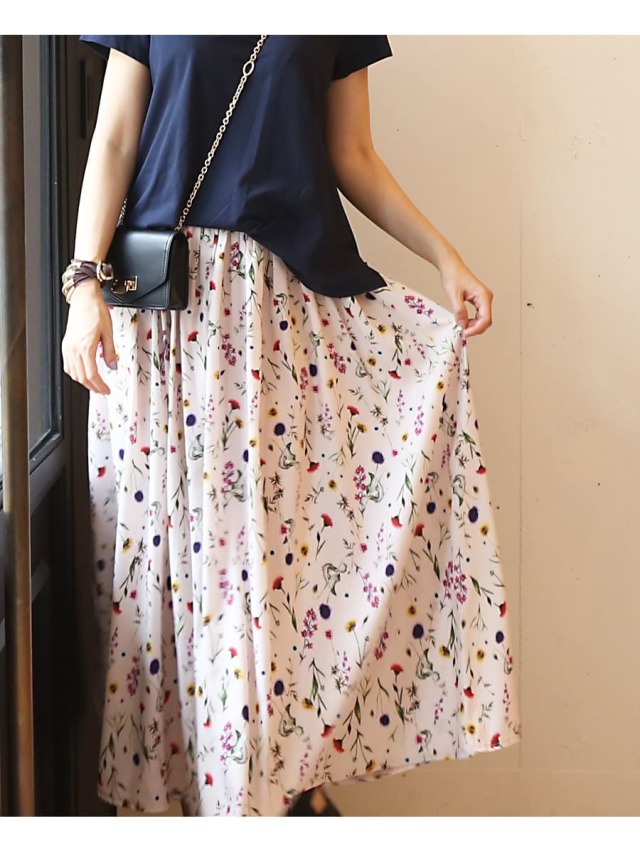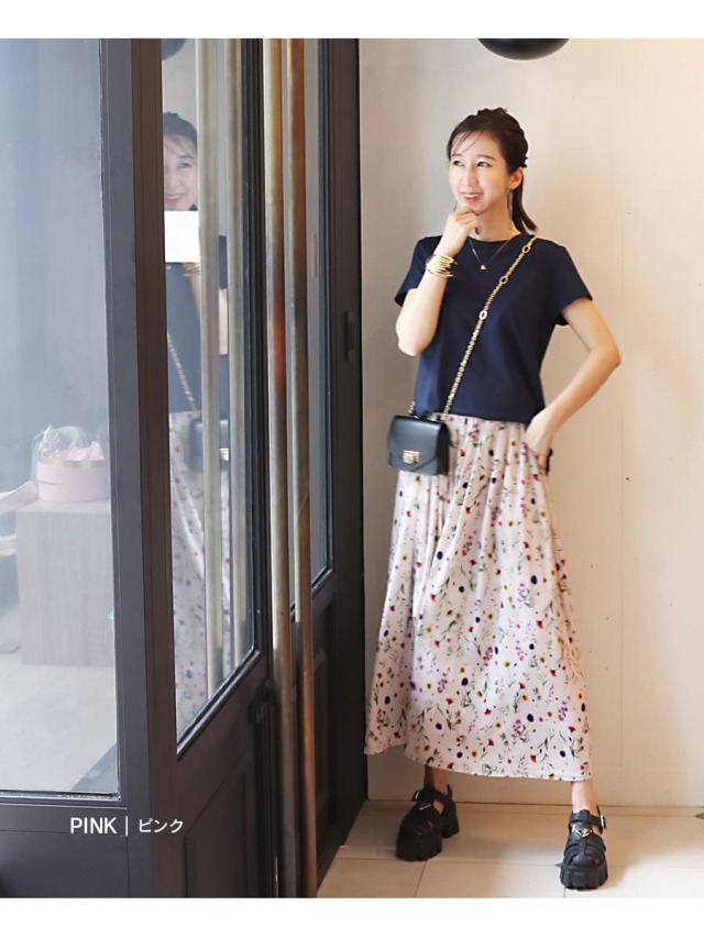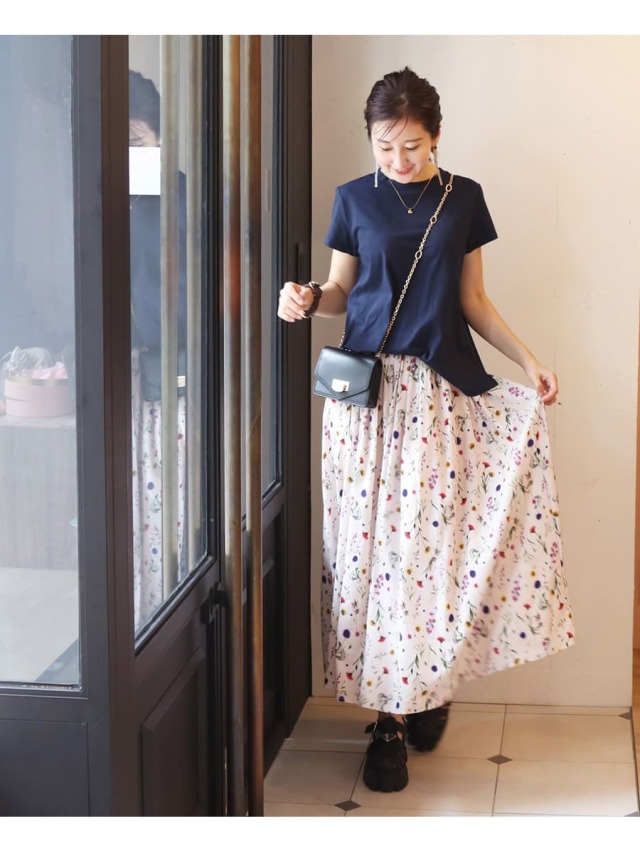 コントラストのあるフラワープリントは派手過ぎないのにしっかり存在感のあるデザインで、きれいめのトップスからカジュアルなTシャツまで、合わせやすい一枚。