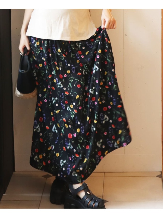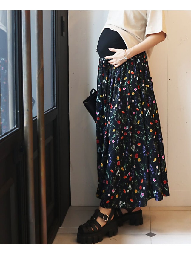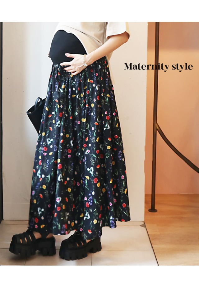 アンティークな雰囲気も漂う鮮やかな配色のフラワー柄をプリントした<マタニティ・産後対応>フレアーロングスカート。