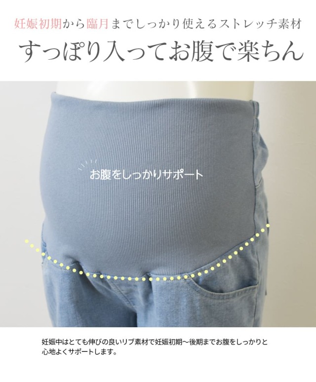 ウエスト部分は伸びの良いストレッチ生地に切り替えられているので、大きくなるお腹もすっぽりと優しく包みこみます。