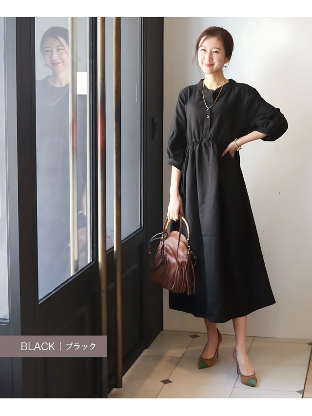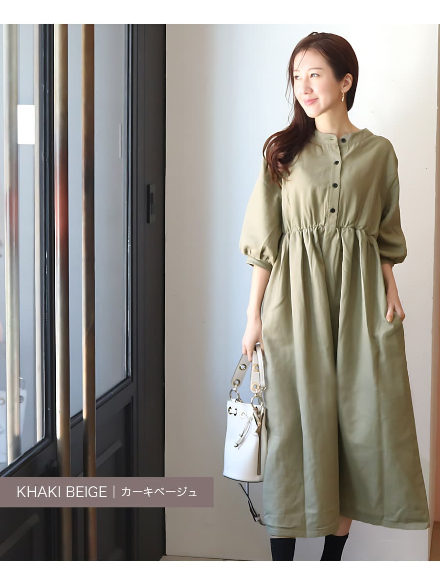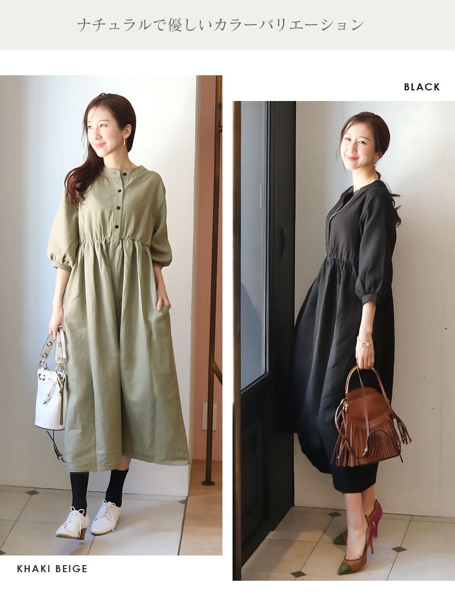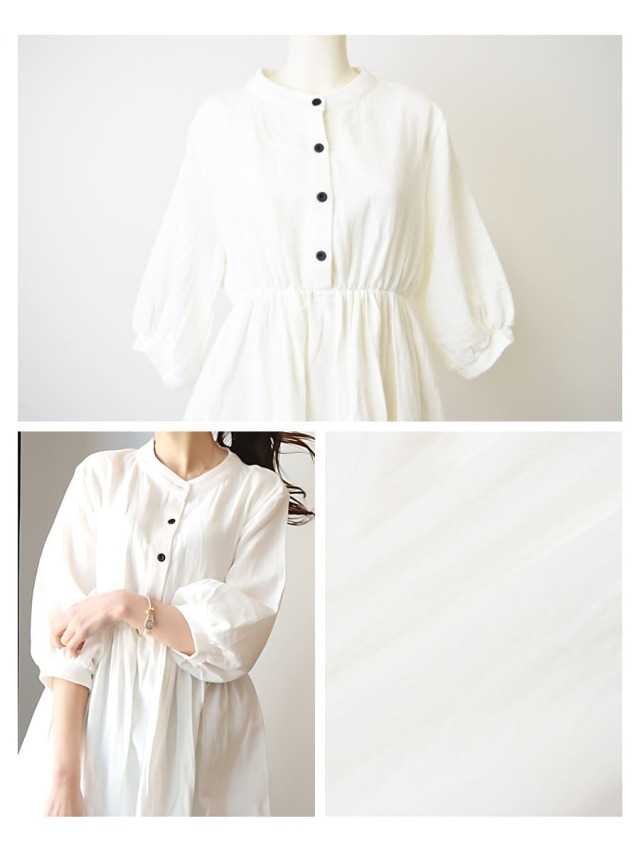●優しい印象のマオカラーの襟元。